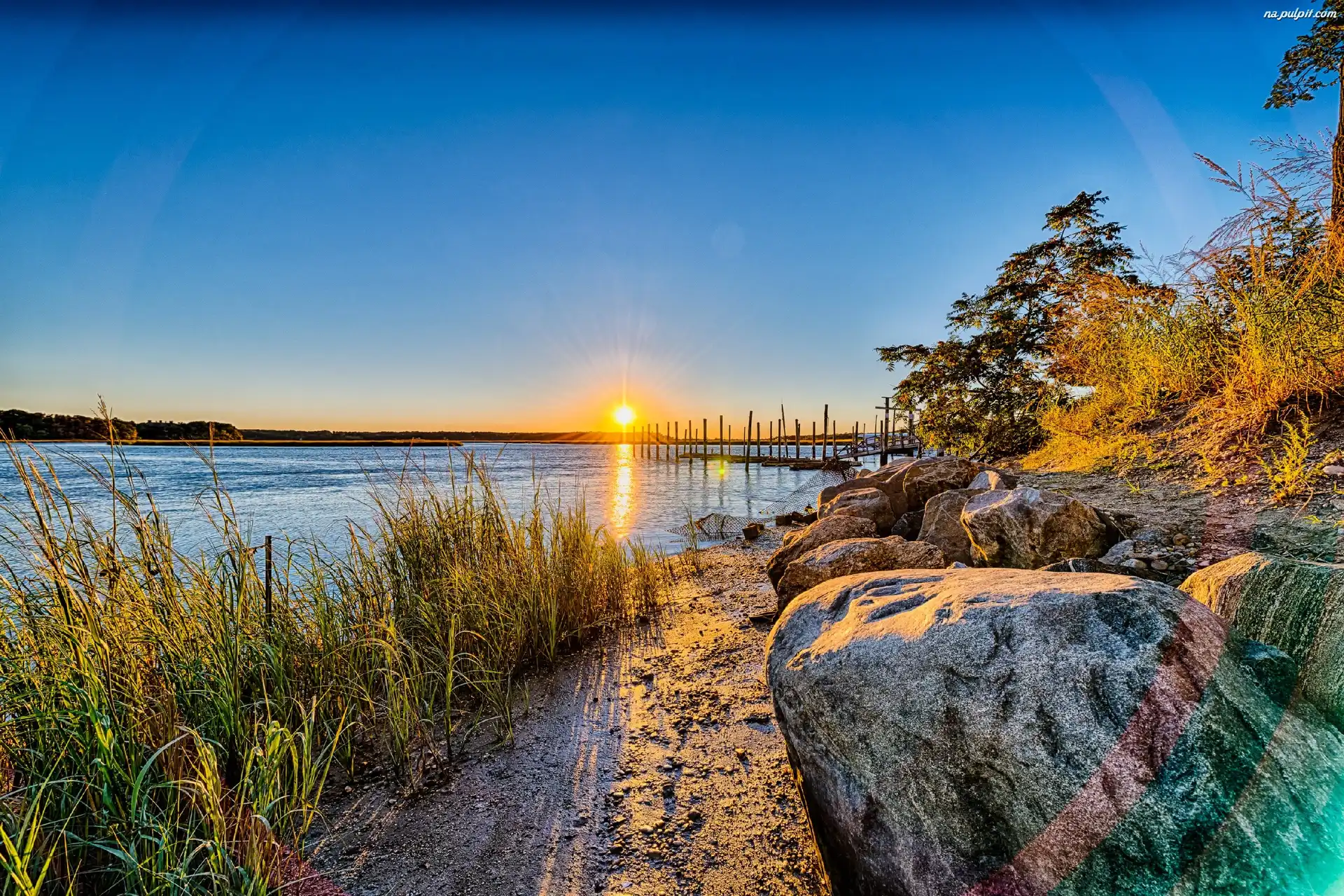 Trawy, Słońca, Zachód, Jezioro, Kamienie Na Pulpit