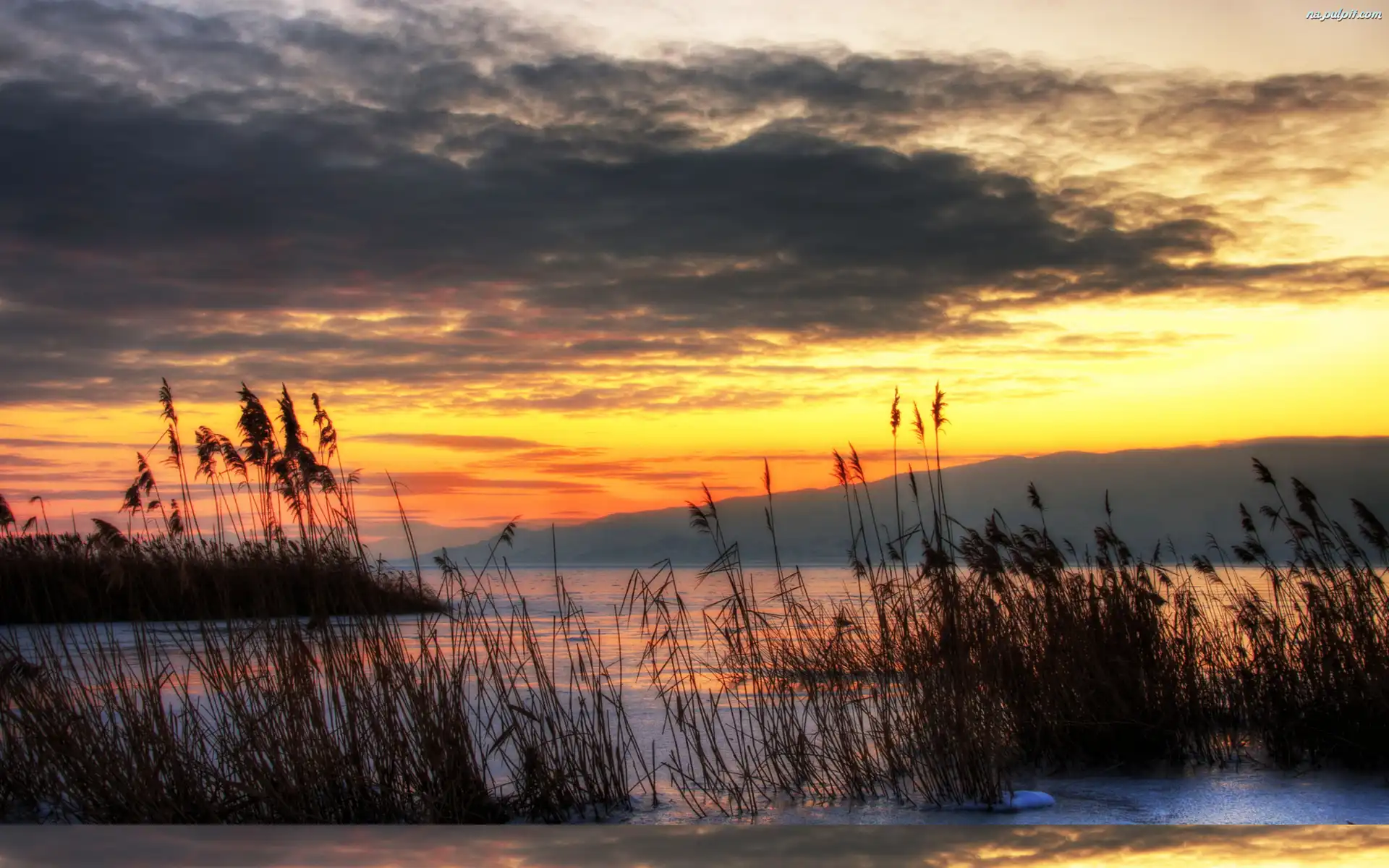 Trawy, Góry, Rzeka, Chmury Na Pulpit