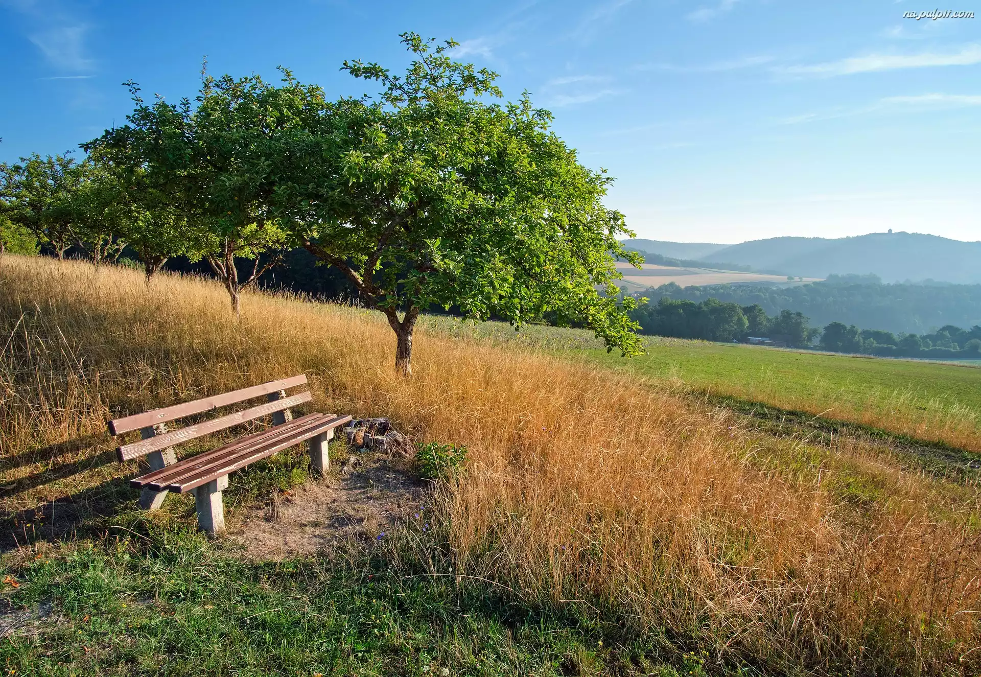 Wzgórze, Drzewa, Ławka, Trawy
