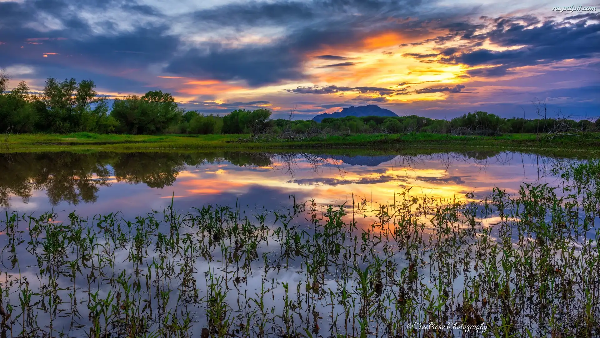 Trawy, Arizona, Hrabstwo Yavapai, Prescott, Zachód słońca, Odbicie, Jezioro, Stany Zjednoczone, Willow Lake Na Pulpit |