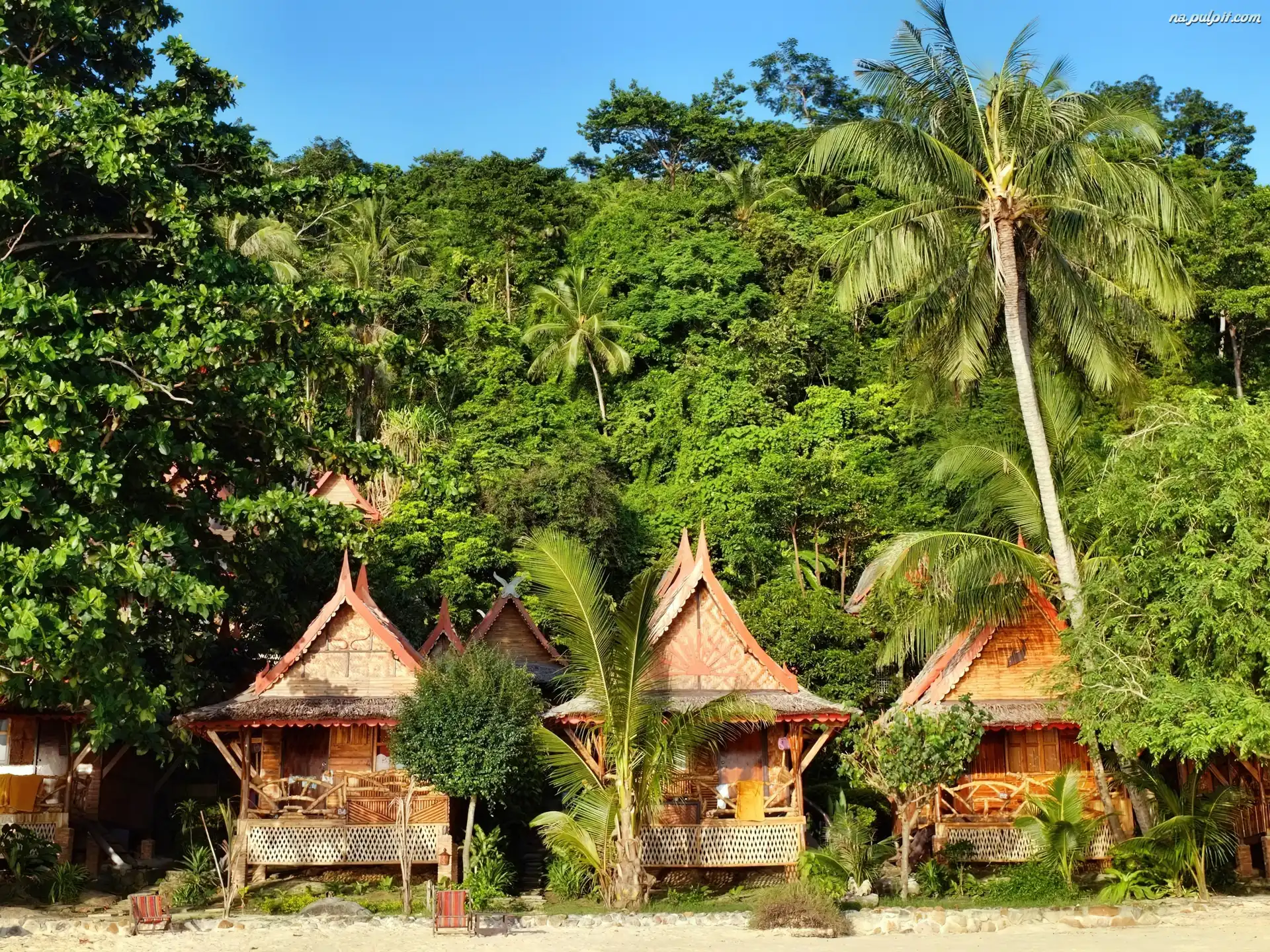 Tropik, Plaży, Na, Domki, Palmy Na Pulpit