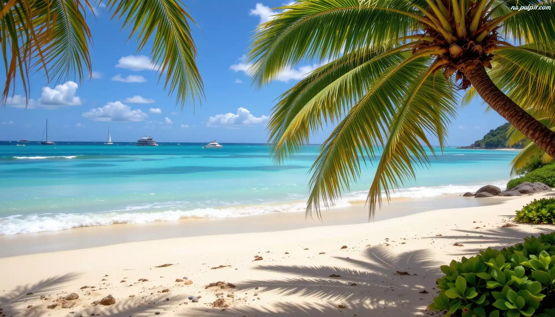 Grafika AI, Jachty, Morze, Plaża, Palmy, Niebo, Tropiki Na Pulpit
