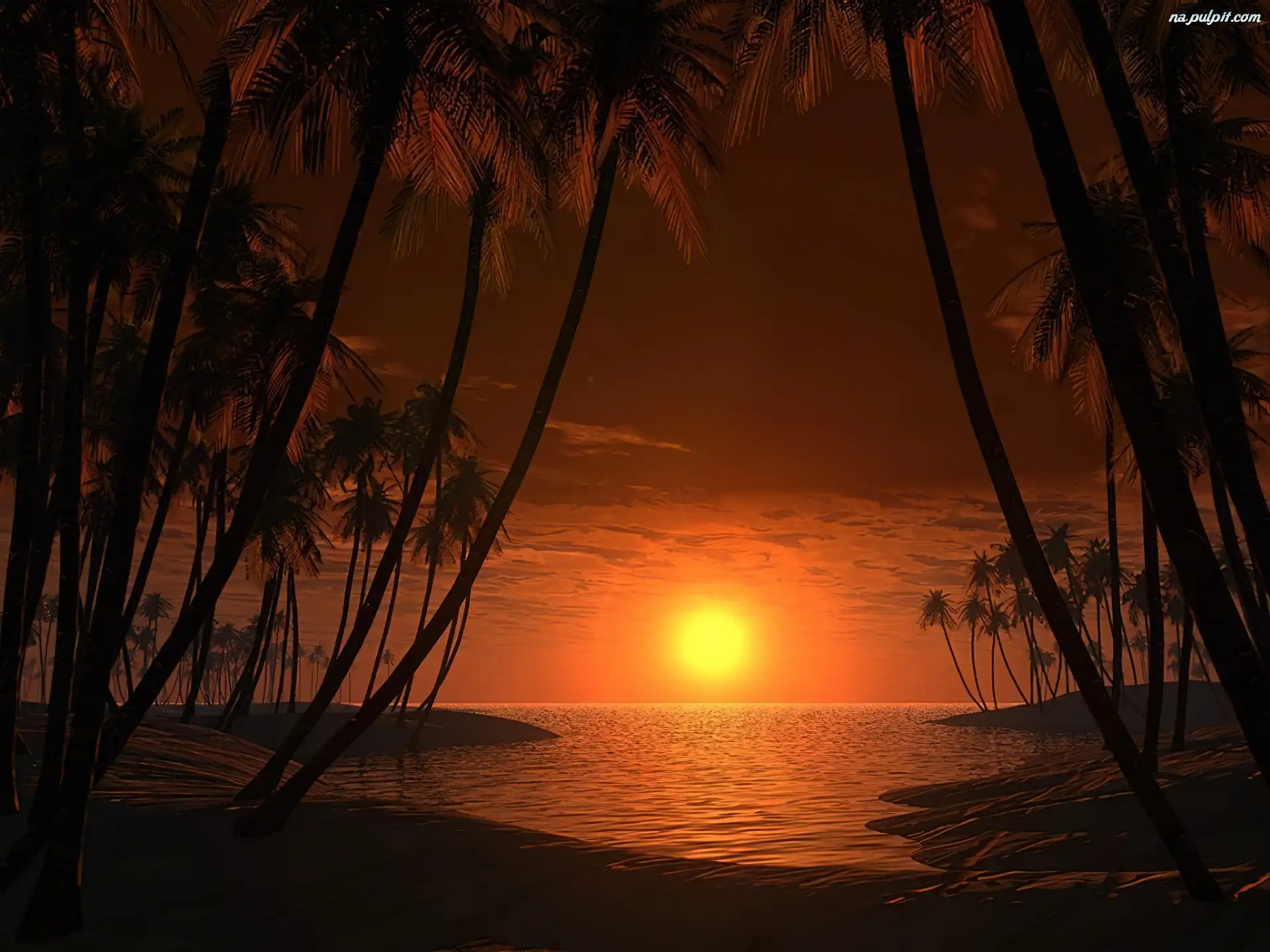 Tropiki, Słońca, Zachód, Palmy, Woda Na Pulpit