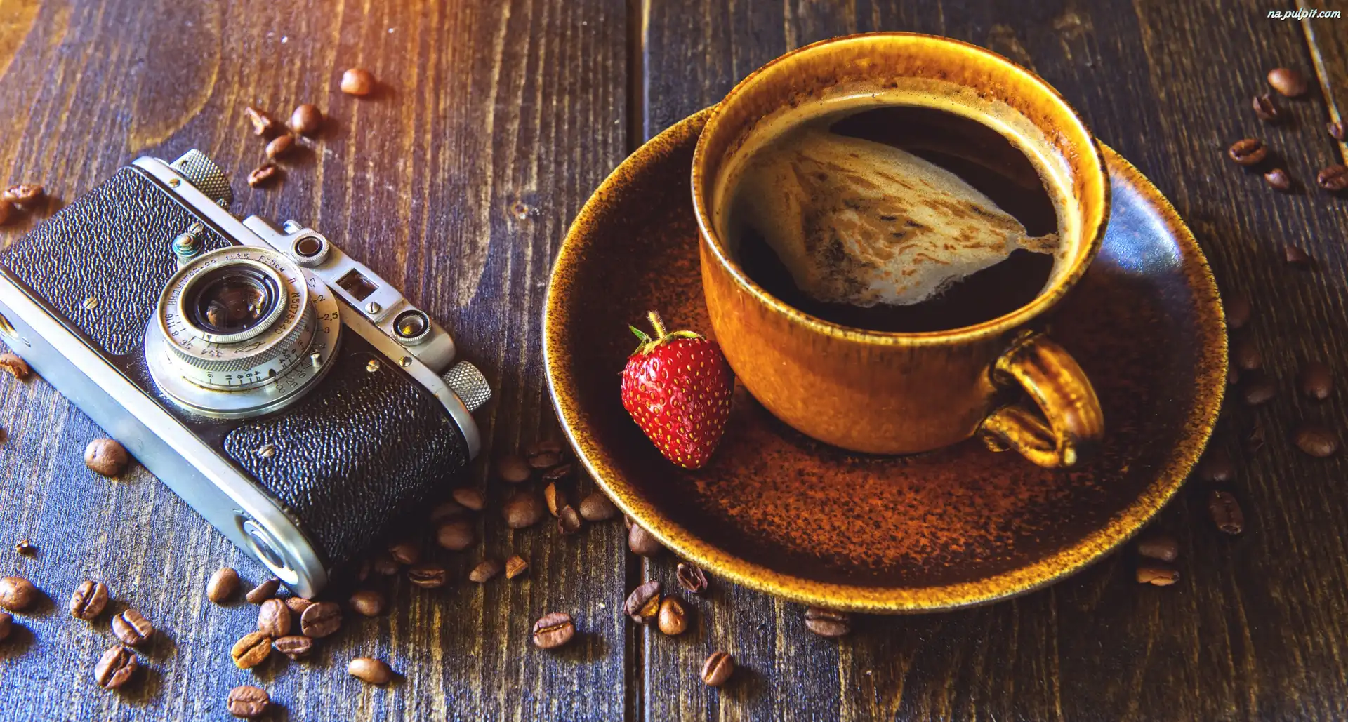 Truskawka, Aparat Fotograficzny, Filiżanka, Kawa, Ziarna Na Pulpit