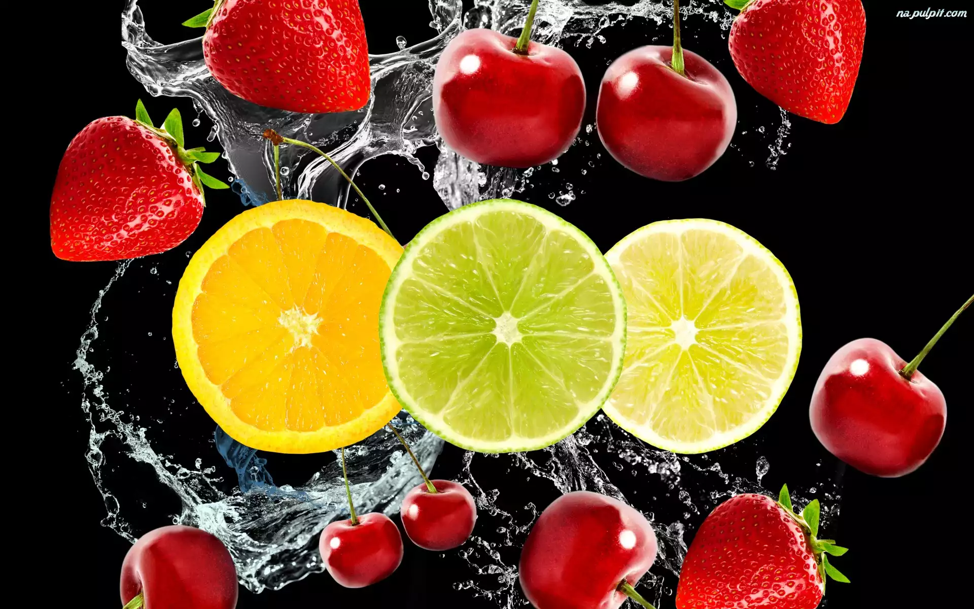 Czereśnie, Pomarańcza, Cytryna, Woda, Tło czarne, Limonka, Owoce, Truskawki Na Pulpit