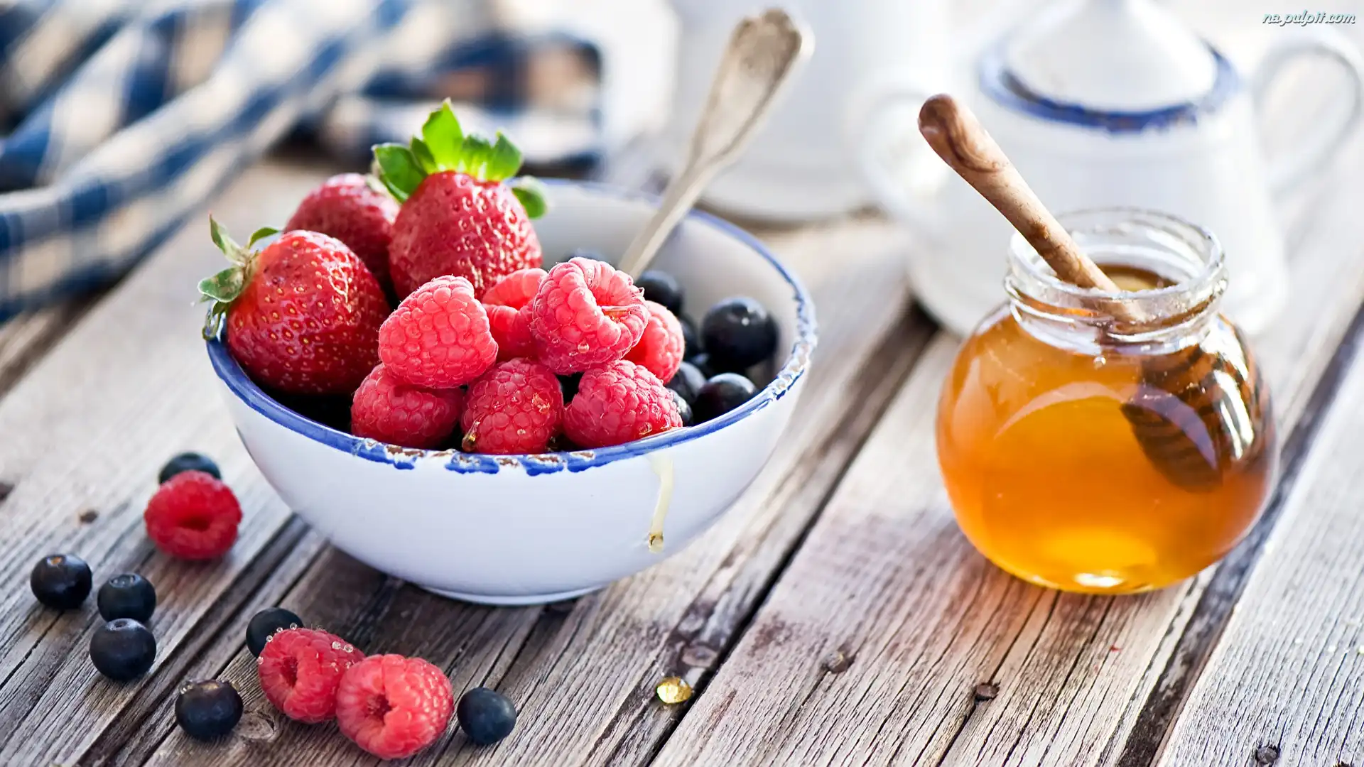 Truskawki, Miseczka, Słoik, Jagody, Maliny, Miód Na Pulpit