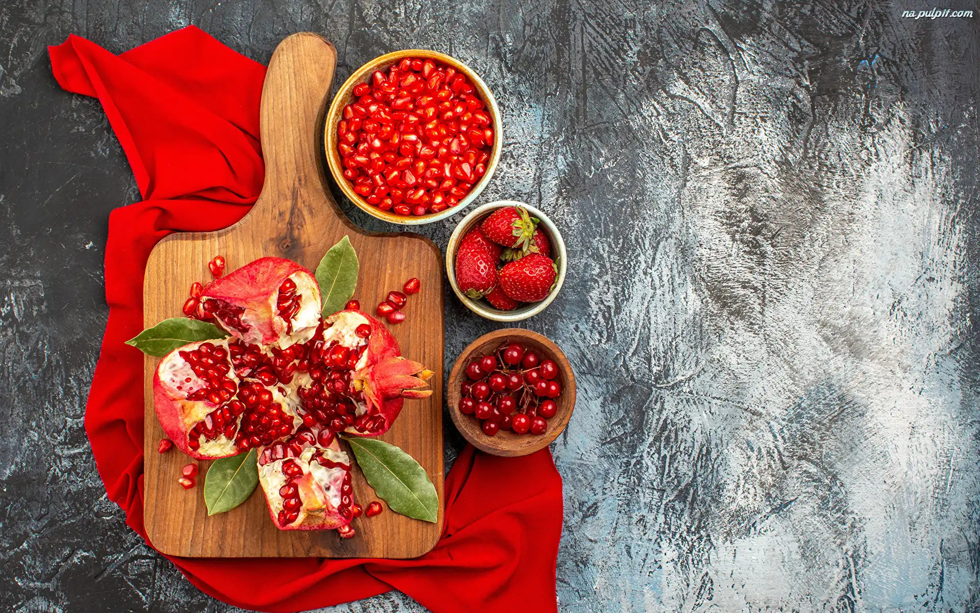 Porzeczki, Granat, Owoce, Deska, Czerwony materiał, Miseczki, Truskawki Na Pulpit