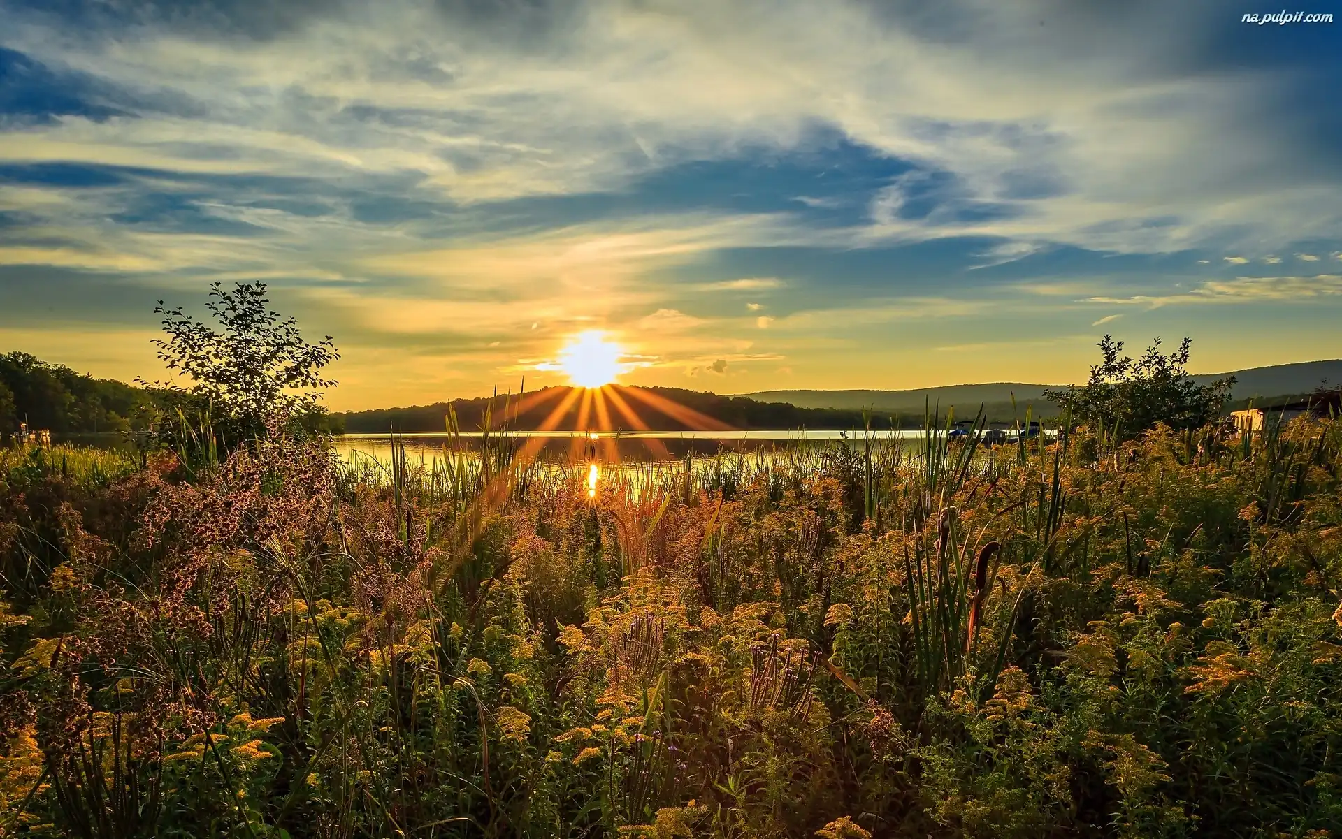 Trzciny, Rzeka, Wzgórza, Wschód Słońca, Zarośla