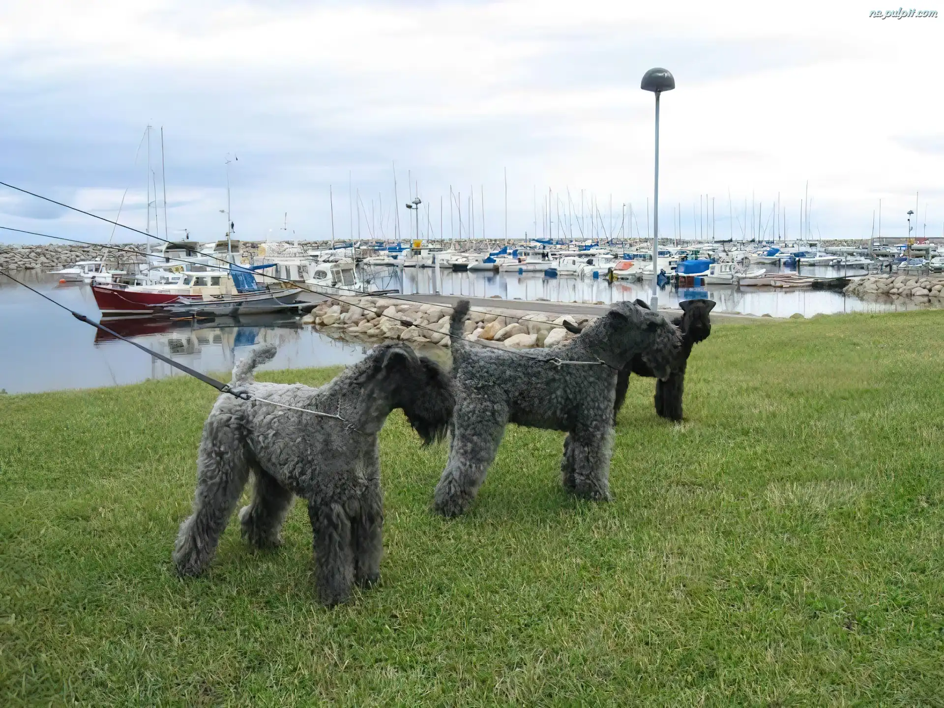 Kerry blue terrier, sofa Kerry blue terrier, śnieg trawa, Kerry blue terrier, soczysta Kerry blue terrier trzy, Kerry blue terrier głowa, Kerry blue terriera