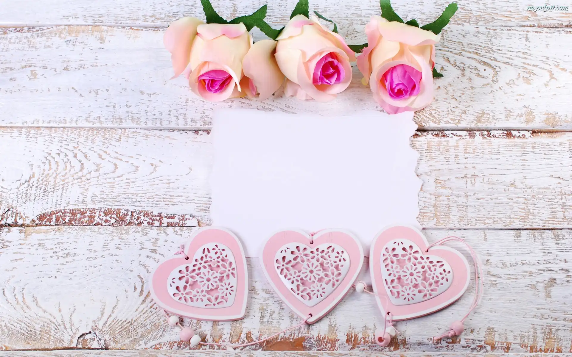 Deski, Trzy, Kartka, Miłosne, Róże, Kwiaty, Serduszka