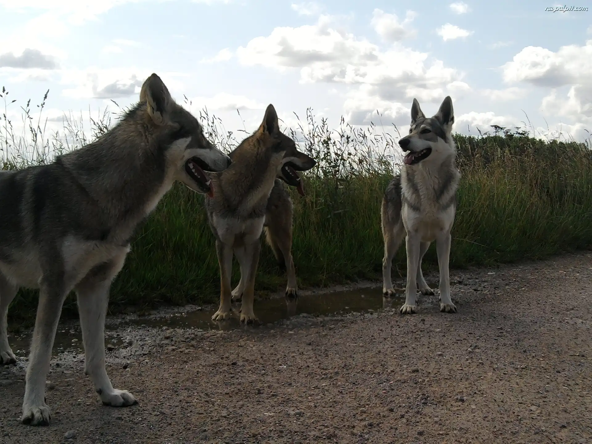trzy, Saarlooswolfhond śnieg, Saarlooswolfhond, las Saarlooswolfhond, łąka Saarlooswolfhond, woda trawa, wysoka, Saarlooswolfhond, zielona krzaki, Saarlooswolfhond, śnieg Saarlooswolfhond Saarlooswolfhond, postawione, uszy