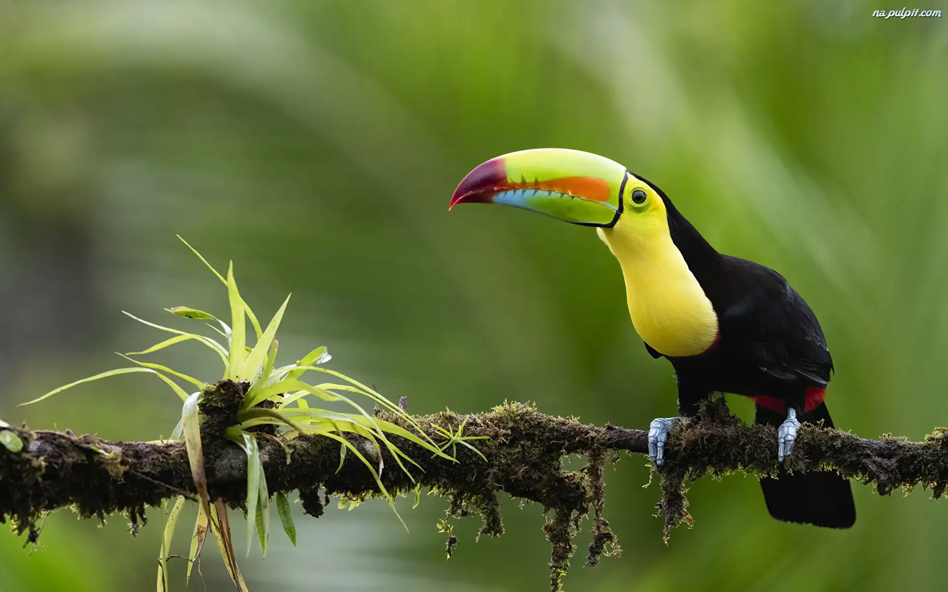 Ptak, Tukan tęczodzioby, Gałąź, Zbliżenie