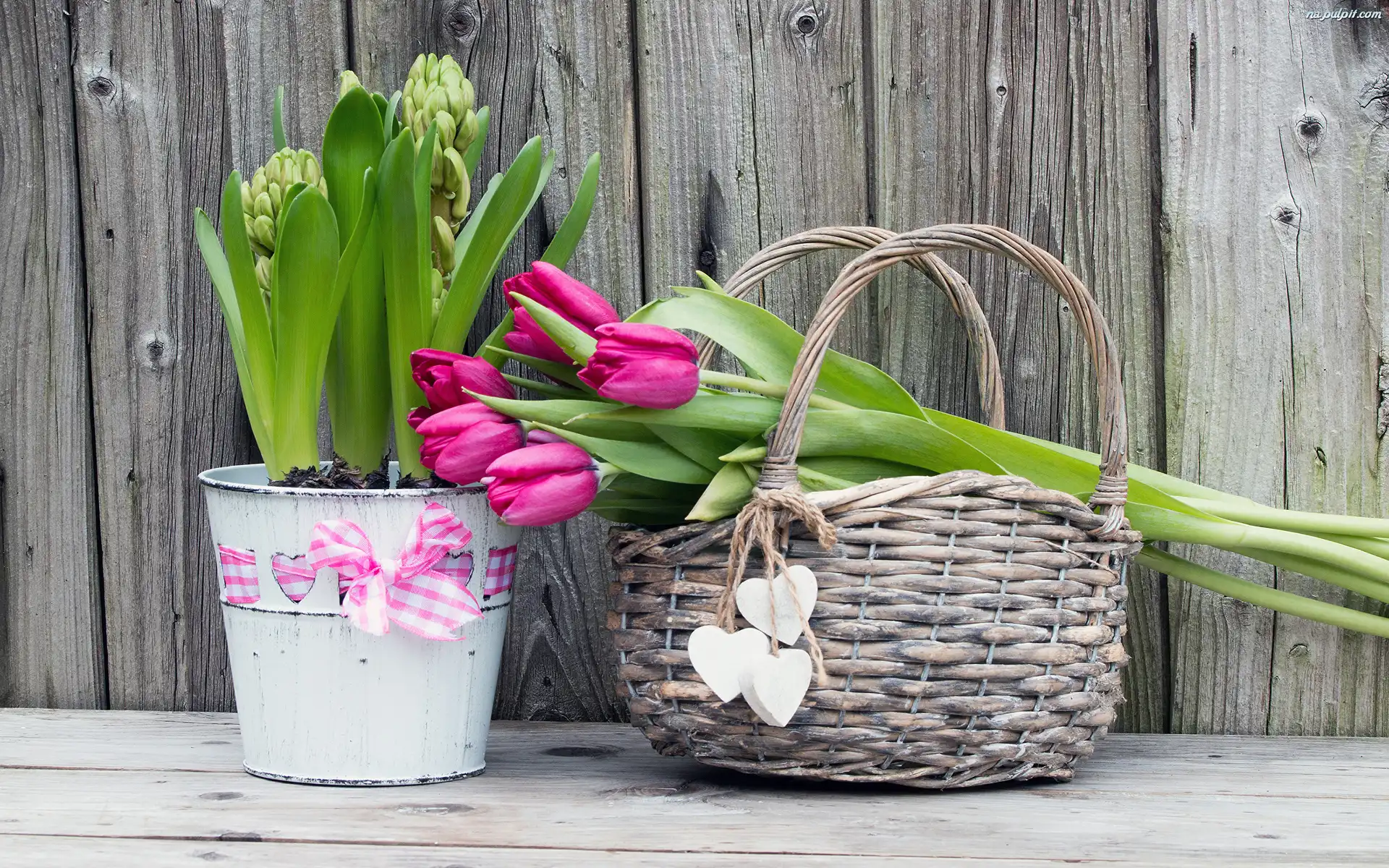 Tulipany, Hiacynty, Wiaderko, Koszyk, Bukiet, Serduszka