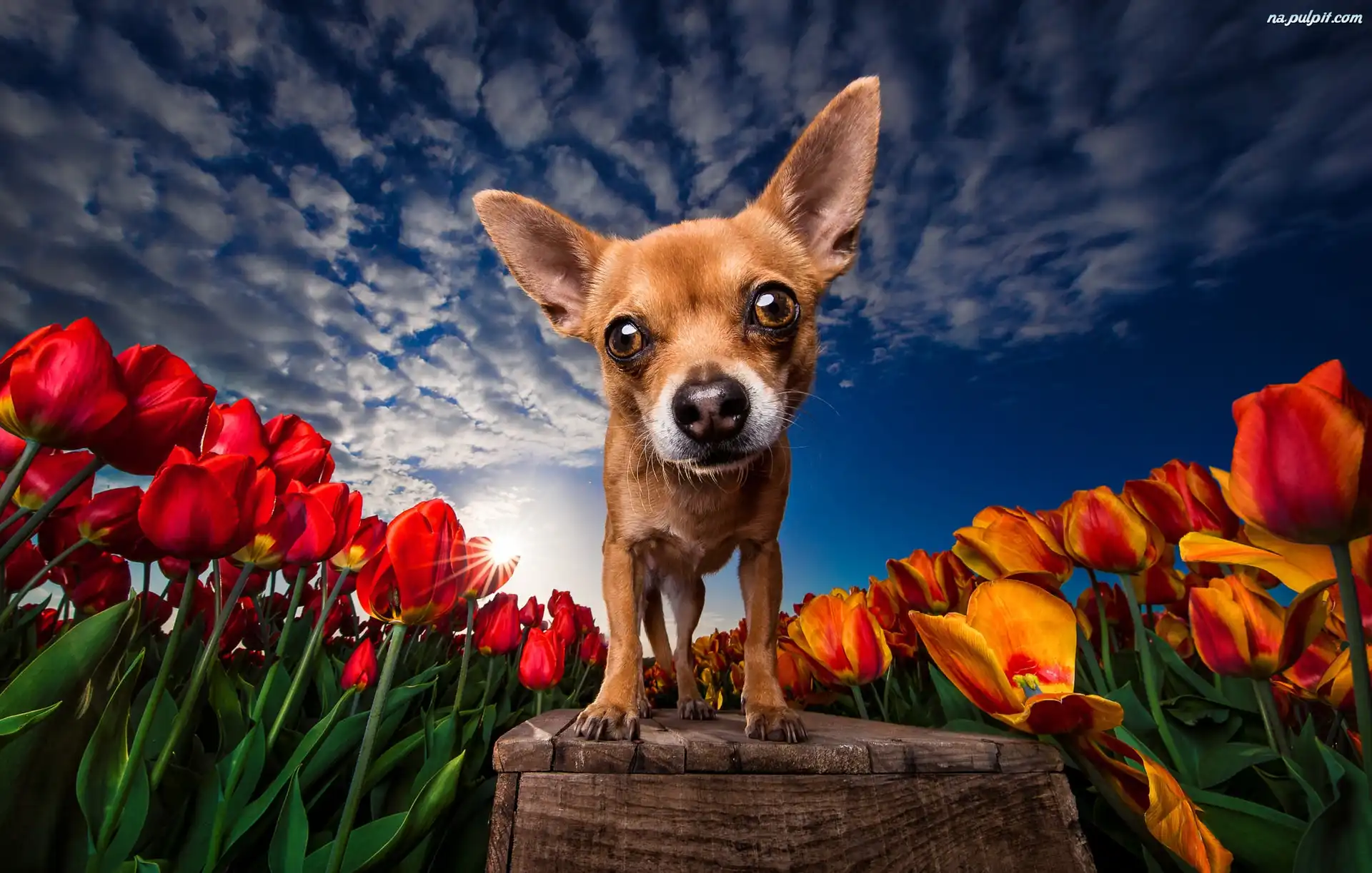 Chihuahua, Tulipany, Promienie słońca, Zbliżenie, Pies, Kwiaty Na Pulpit