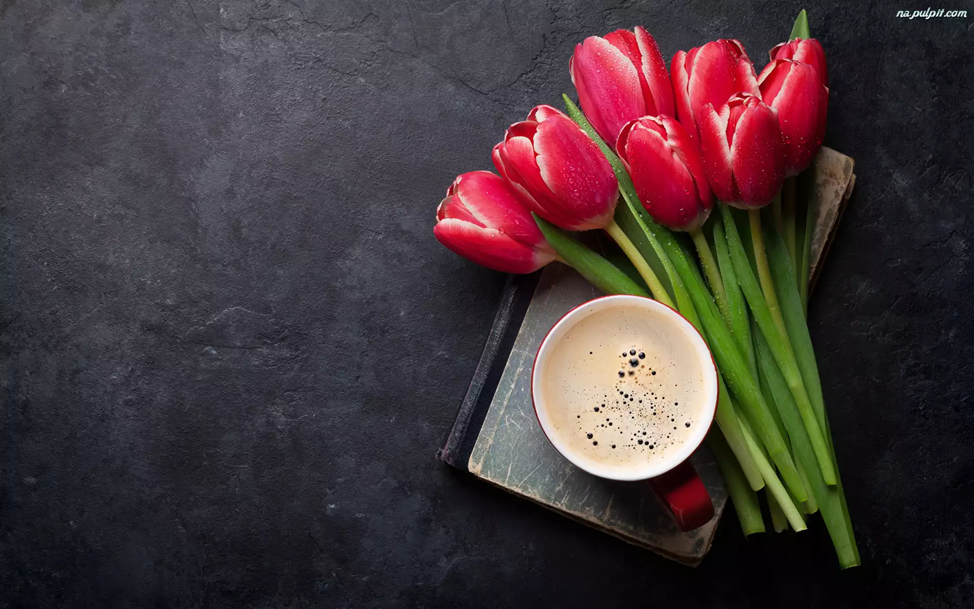 Ciemne tło, Czerwone, Kwiaty, Książka, Filiżanka, Kawa, Tulipany Na Pulpit