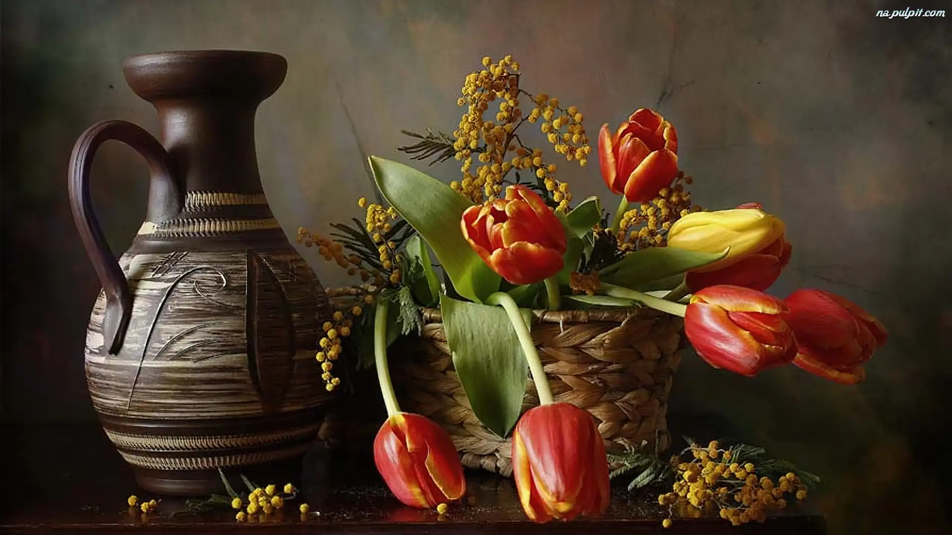 Tulipany, Dzban, Gliniany, Koszyk Na Pulpit