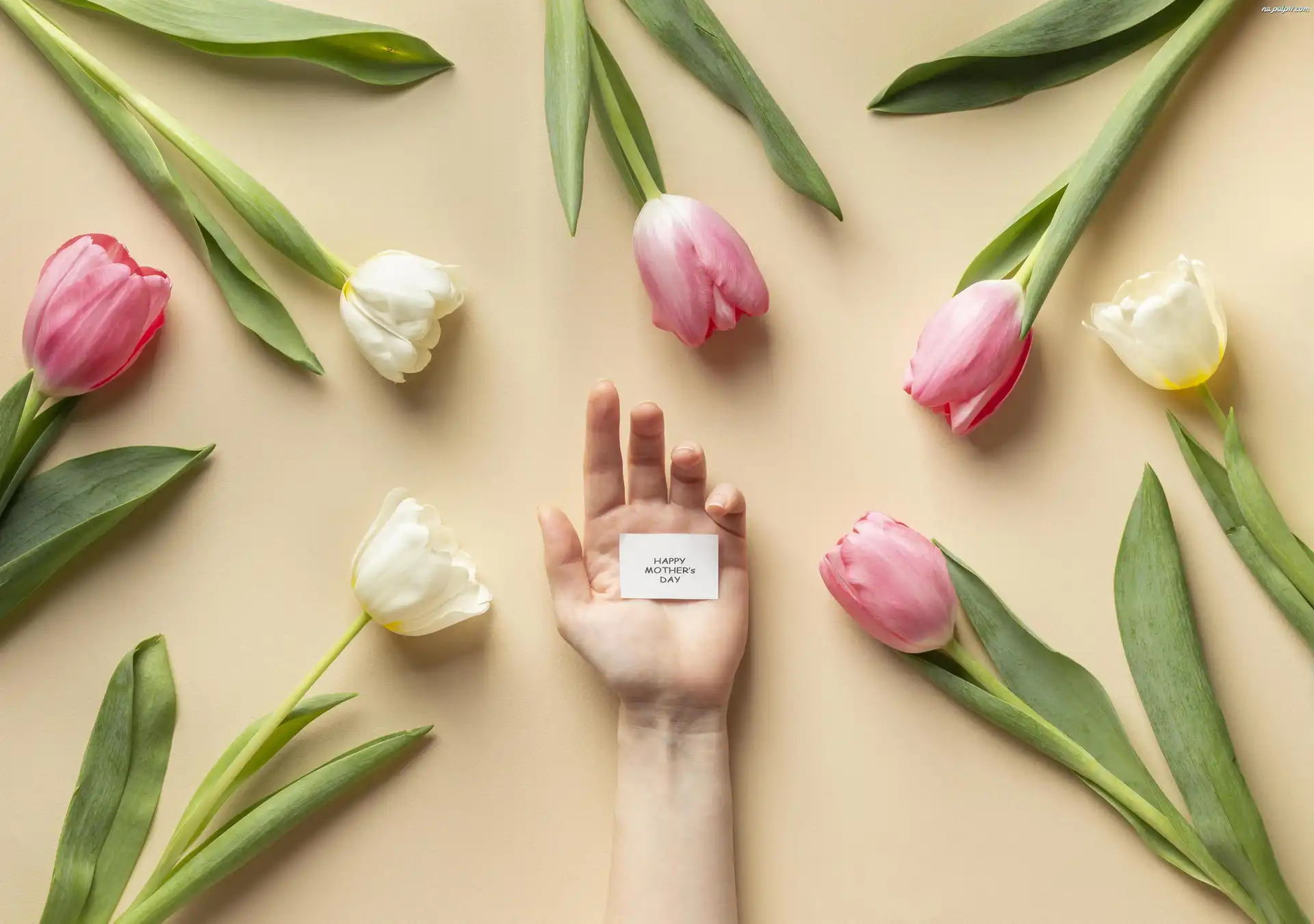 Happy Mothers Day, Kwiaty, Kolorowe, Tulipany, Jasne, Tło, Ręka, Dzień Matki, Napis