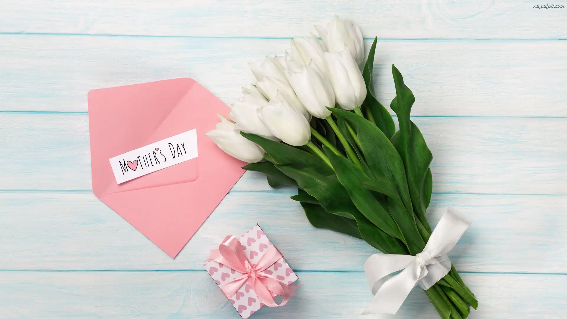 Wstążka, Tulipany, Napis, Koperta, Prezent, Dzień Matki, Kartka