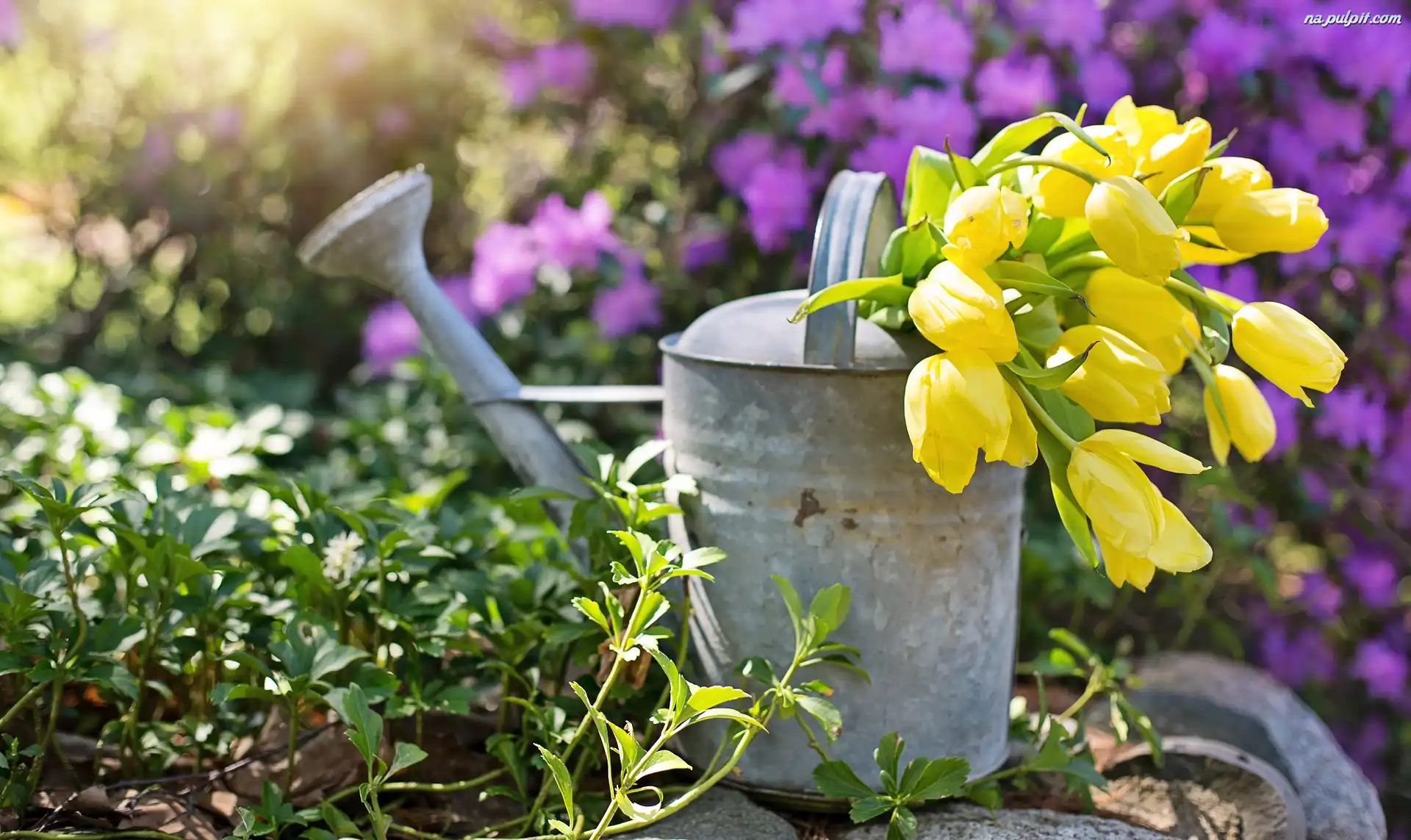 Tulipany, Kwiaty, Bukiet, Konewka, Żółte Na Pulpit