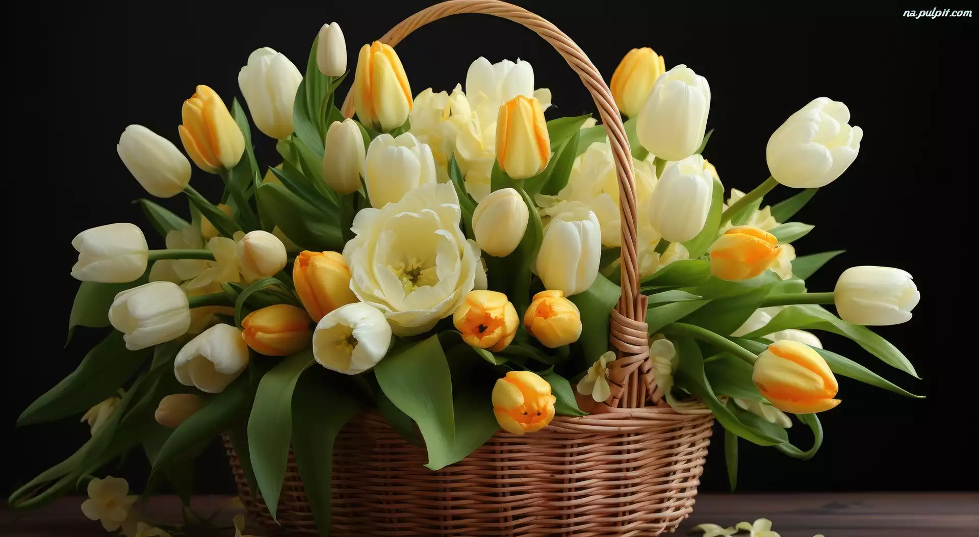 Listki, Kwiaty, Żółte, Tulipany, Białe, Koszyk