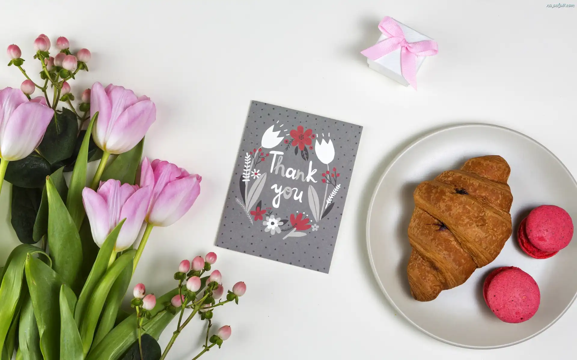 Podziękowanie, Tulipany, Kartka, Makaroniki, Croissant, Kwiaty, Prezent Na Pulpit