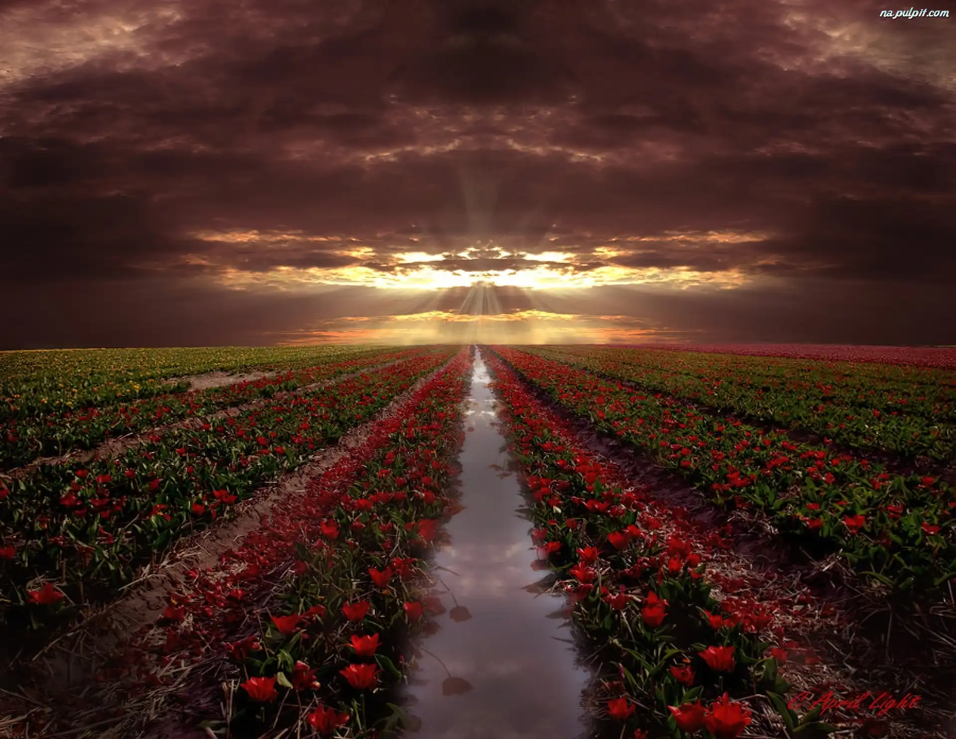 Tulipany, Promienie, Zachód Słońca, Pole Na Pulpit