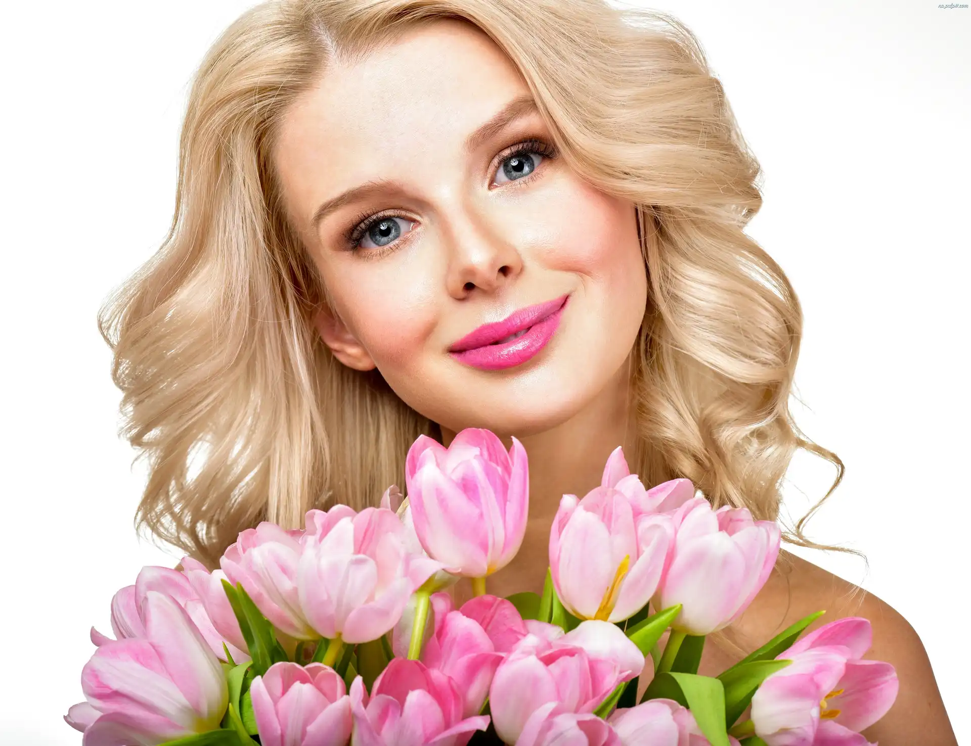 Tulipany, Kobieta, Uśmiechnięta, Makijaż