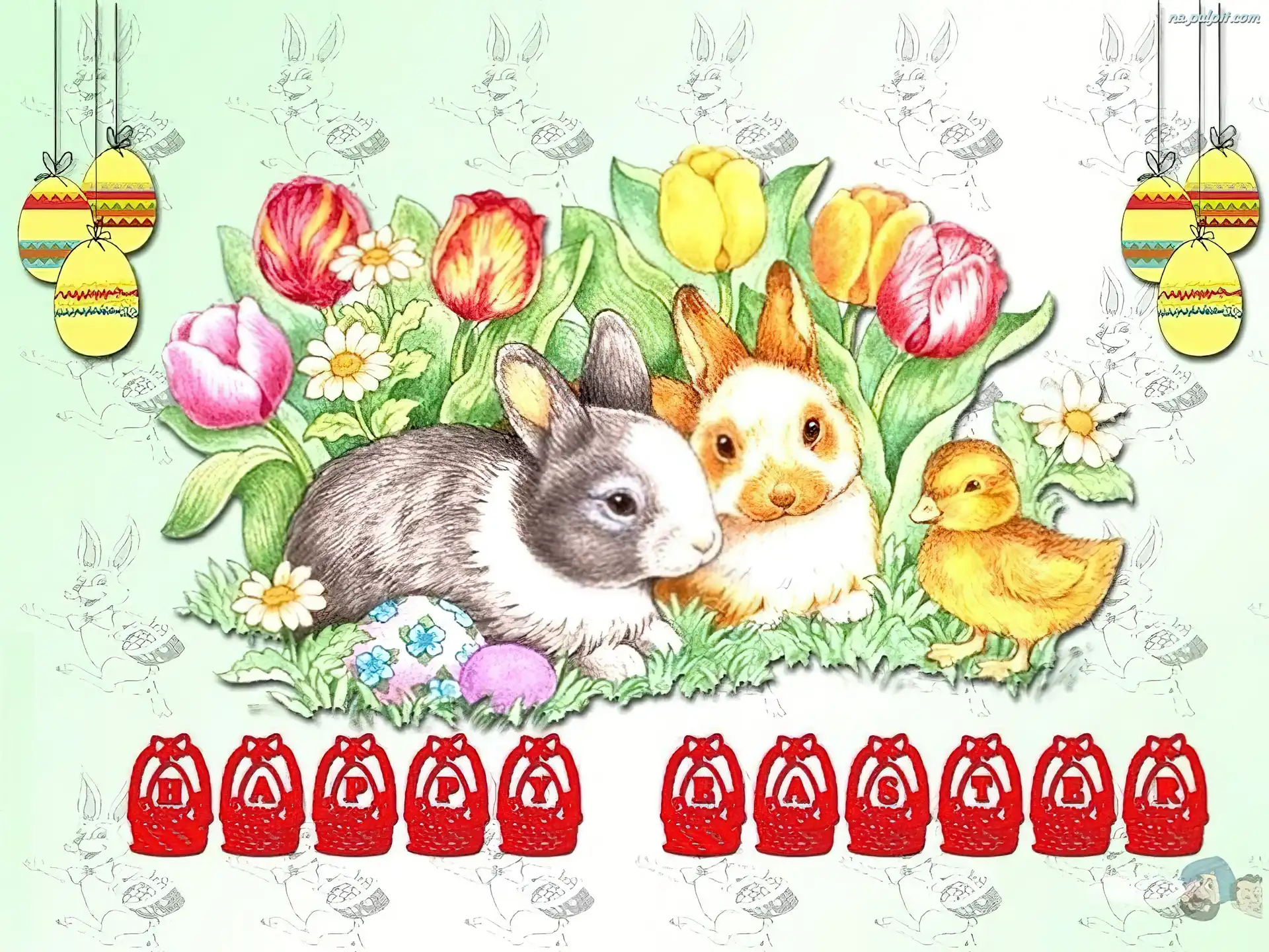 Tulipany, kurczaczek, zajÄ…czki, Wielkanoc, jajeczka Na Pulpit