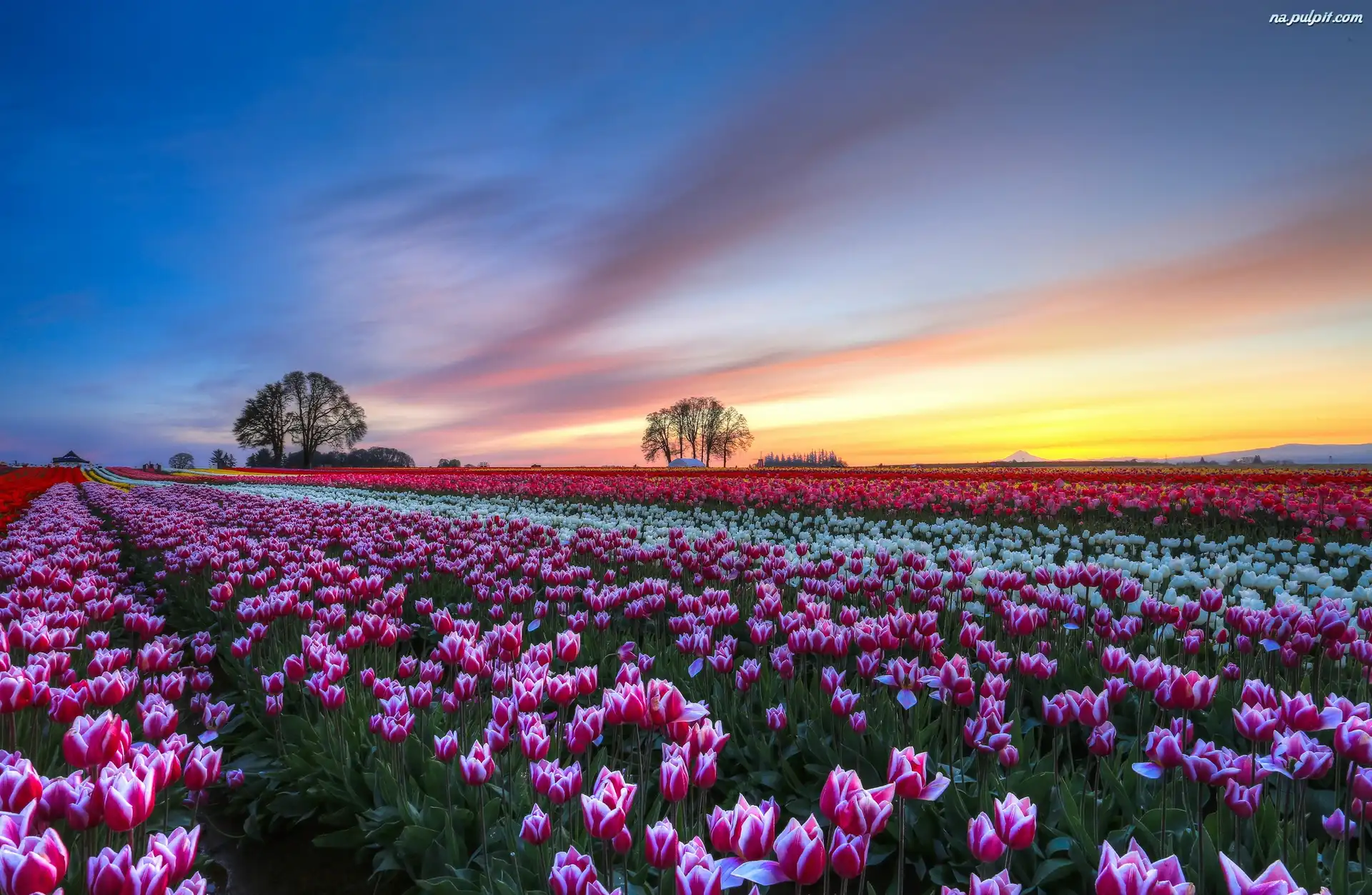 Tulipany, Pole, Słońca, Zachód, Drzewa Na Pulpit