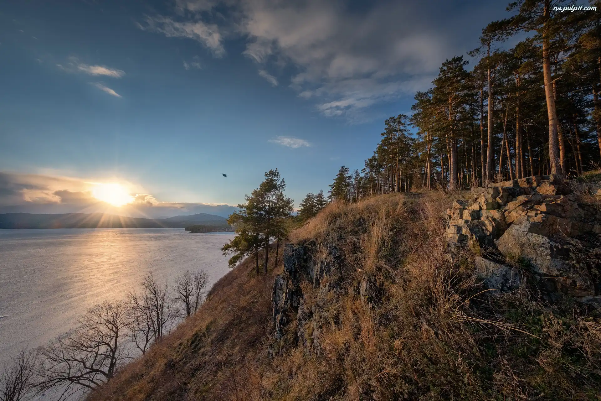 Sosny, Jezioro Turgoyak, Niebo, Obwód czelabiński, Rosja, Kamienie, Wschód słońca, Drzewa Na Pulpit |