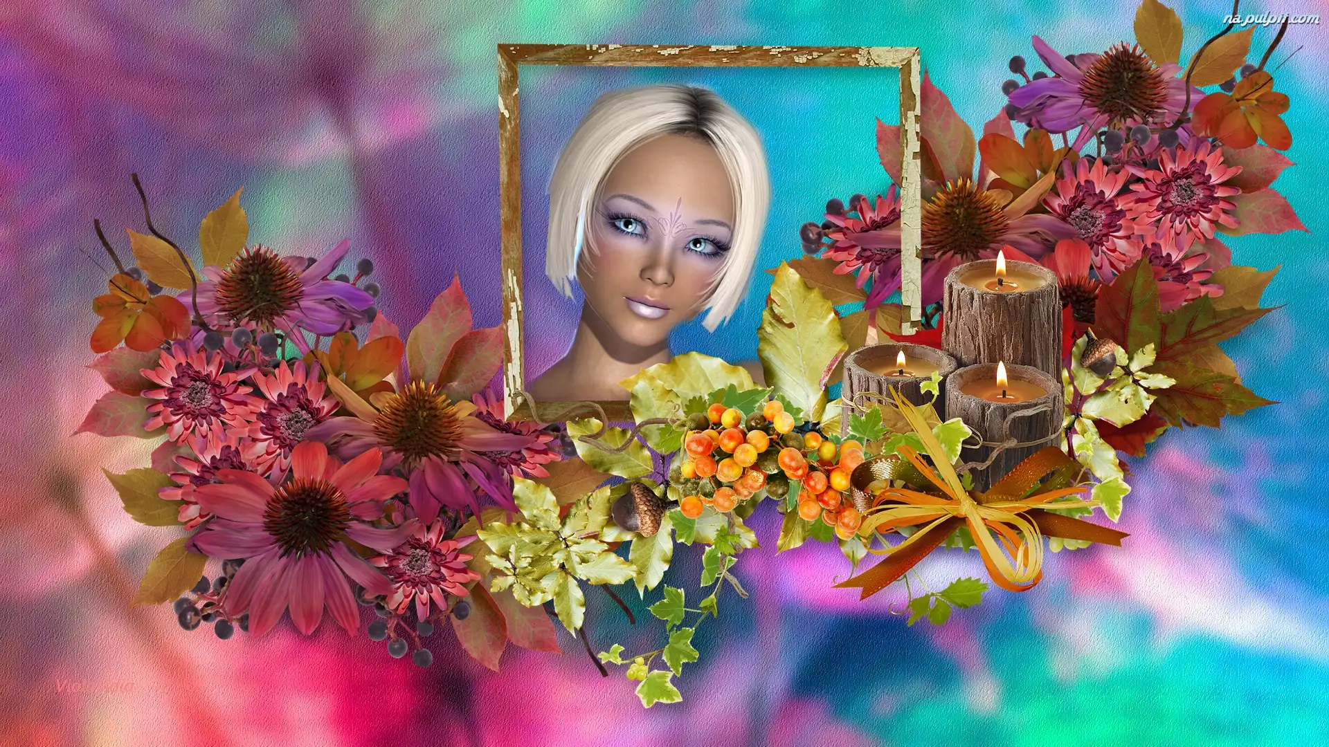 Twarz, Kompozycja, Åšwiece, Kobieta, Grafika, Kwiaty