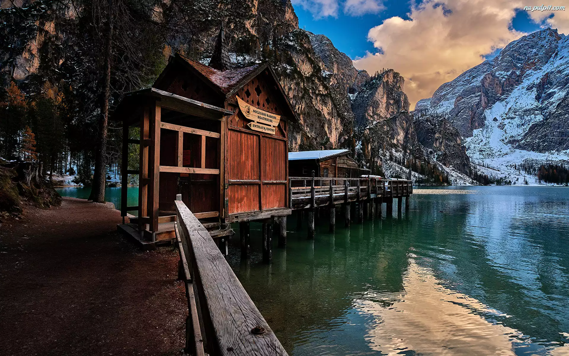 Domy, Pomost, Południowy Tyrol, Dolomity, Jezioro, Góry, Włochy, Lago di Braies, Pragser Wildsee Na Pulpit |