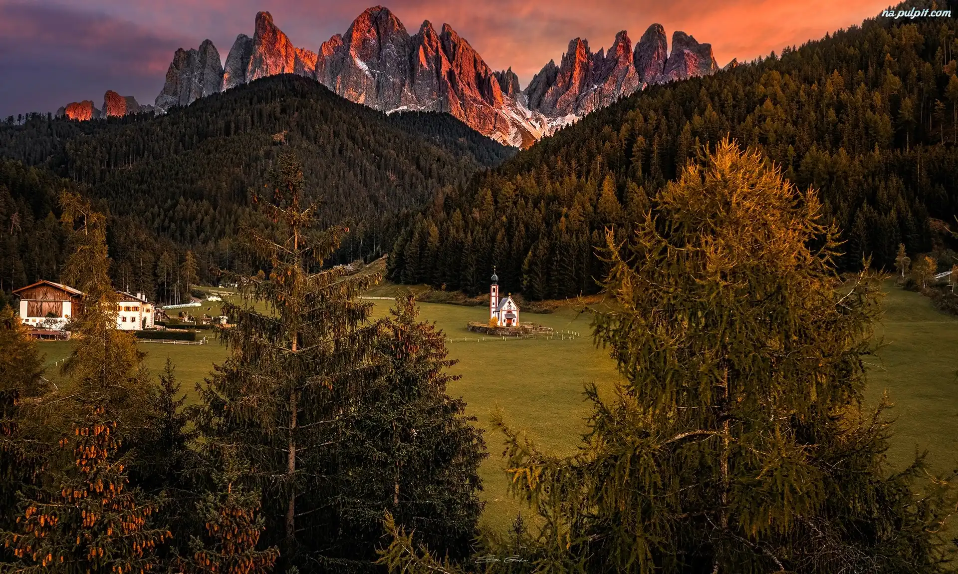 Dolina Val di Funes, Drzewa, Południowy Tyrol, Dolomity, Kościół św Jana, Góry, Włochy, Santa Maddalena, Wieś Na Pulpit |