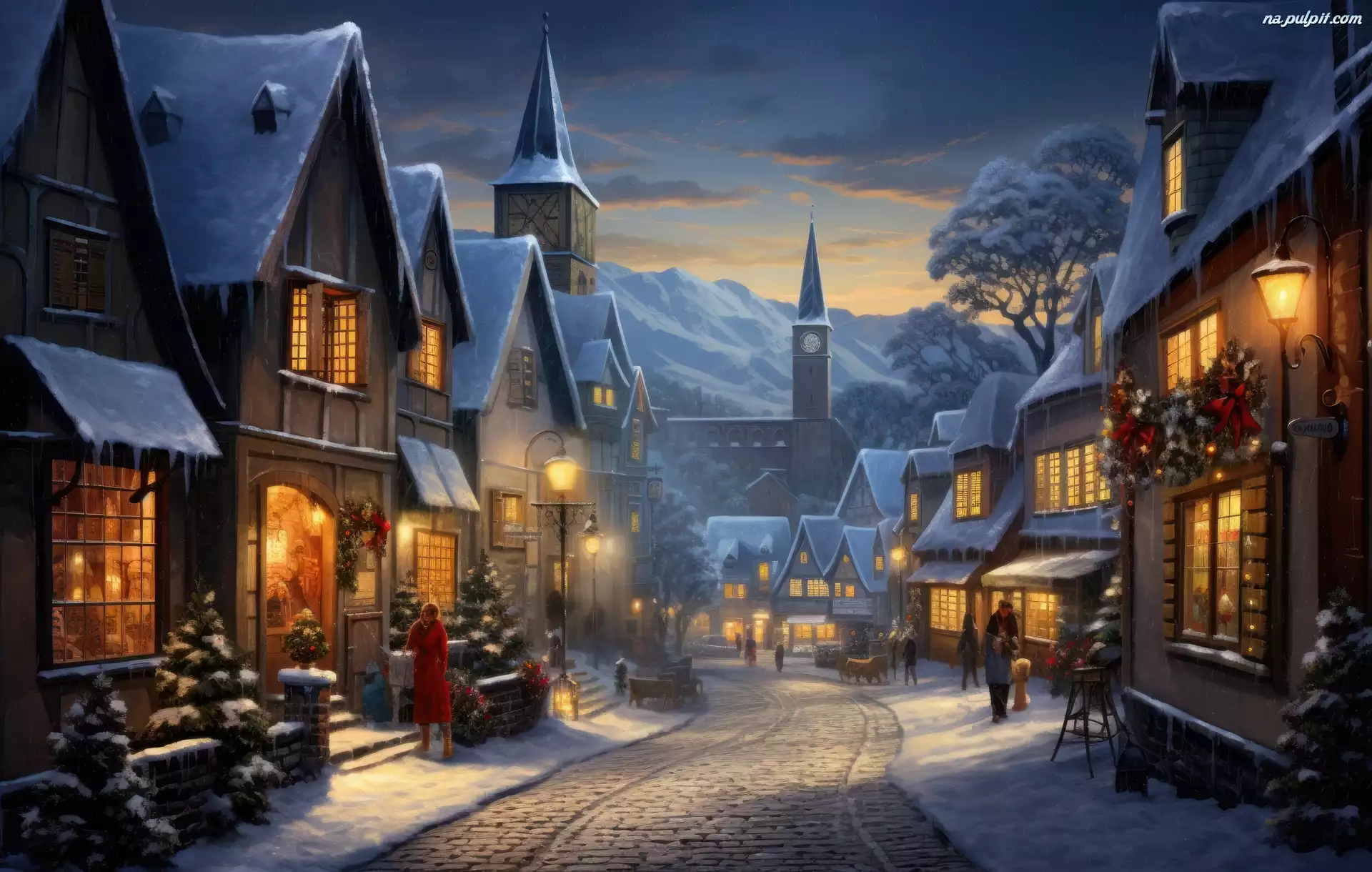 Ludzie, Zima, Domy, Ulica, Góry, 2D Na Pulpit