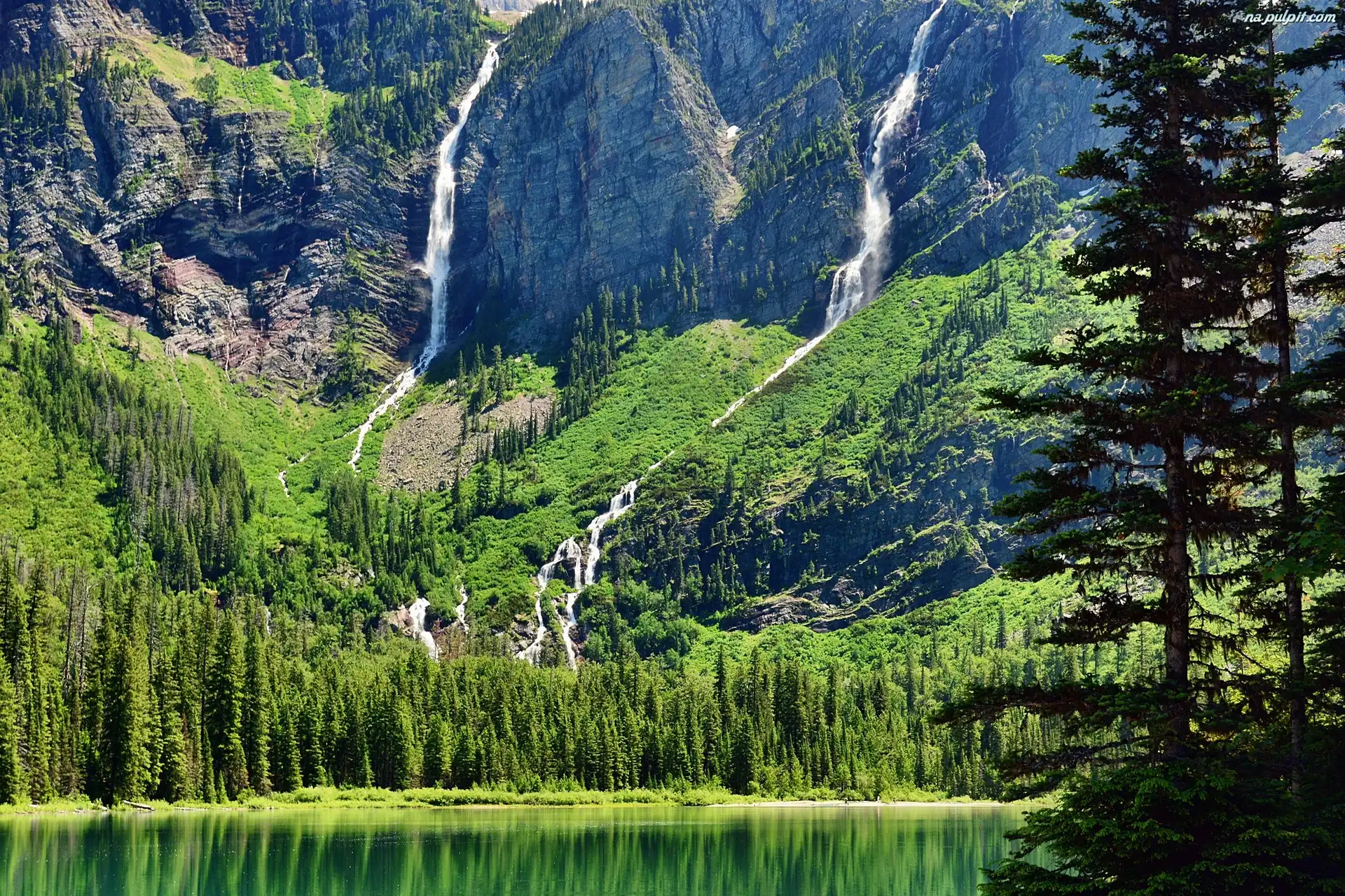 Wodospady, Stan Montana, Drzewa, Jezioro Hidden Lake, Park Narodowy Glacier, Stany Zjednoczone, Góry Na Pulpit |
