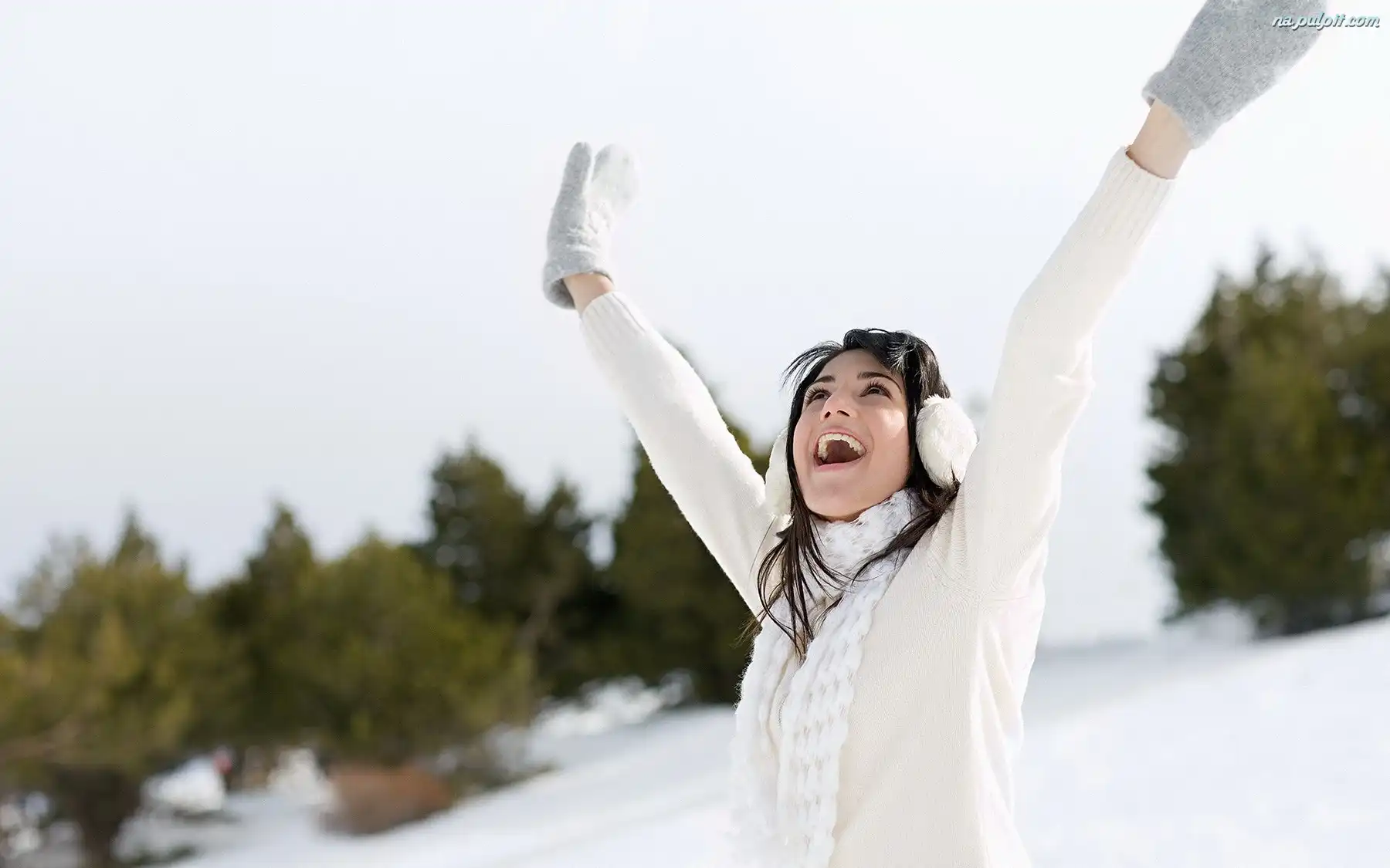 Uśmiech, Zima, Śnieg, Szalik, Brunetka, Rękawiczki Na Pulpit