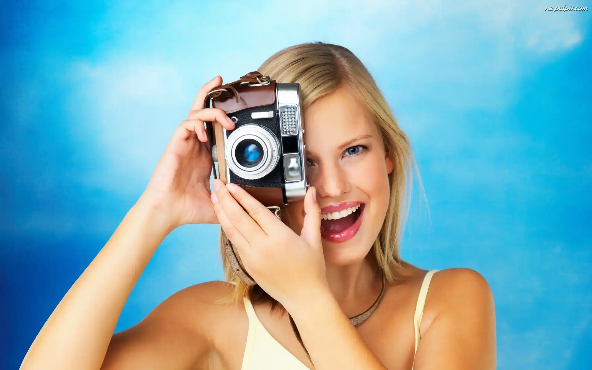 Aparat, Uśmiechnięta, Blondynka Na Pulpit