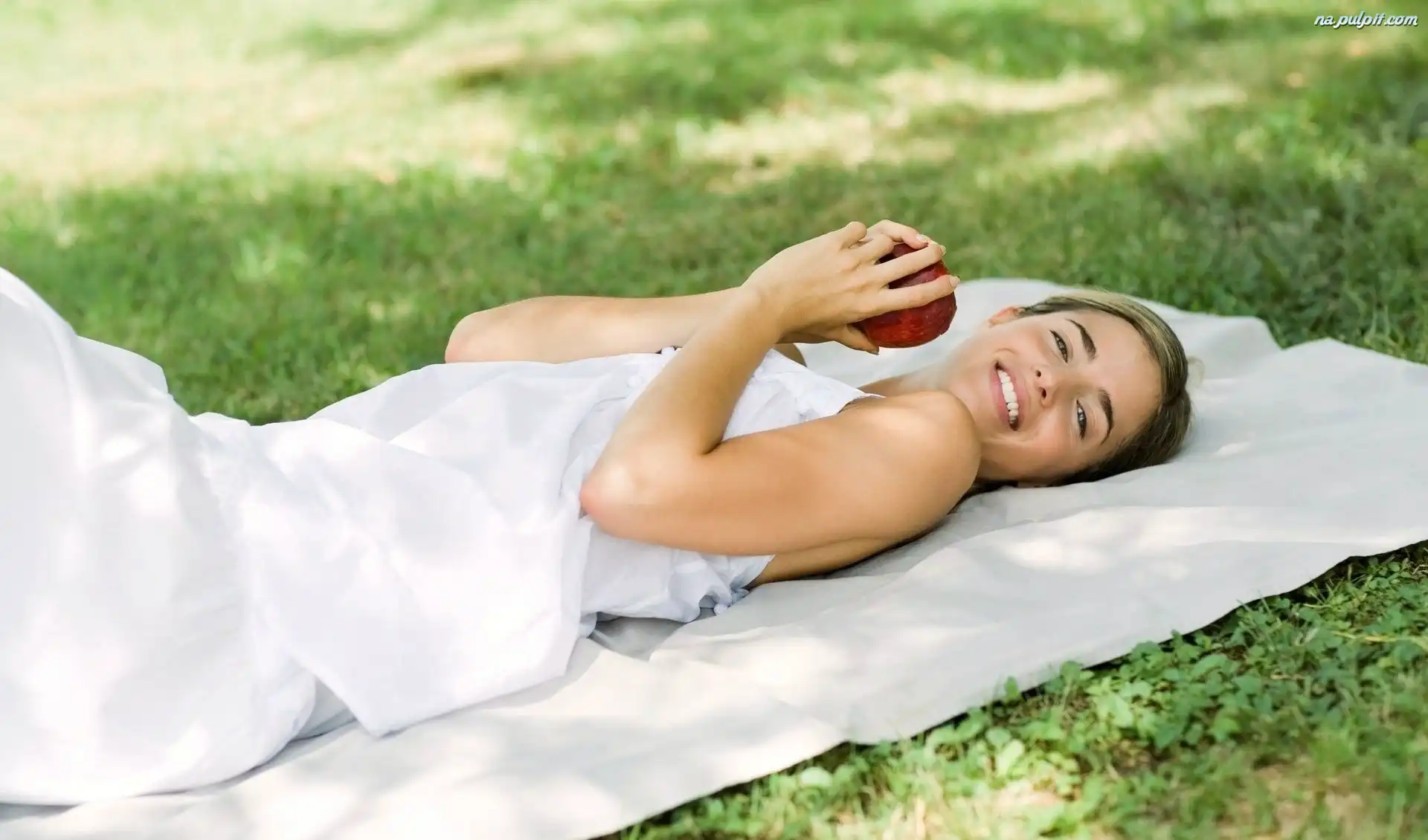 Łąka, Jabłko, Kobieta, Uśmiechnięta, Odpoczynek Na Pulpit