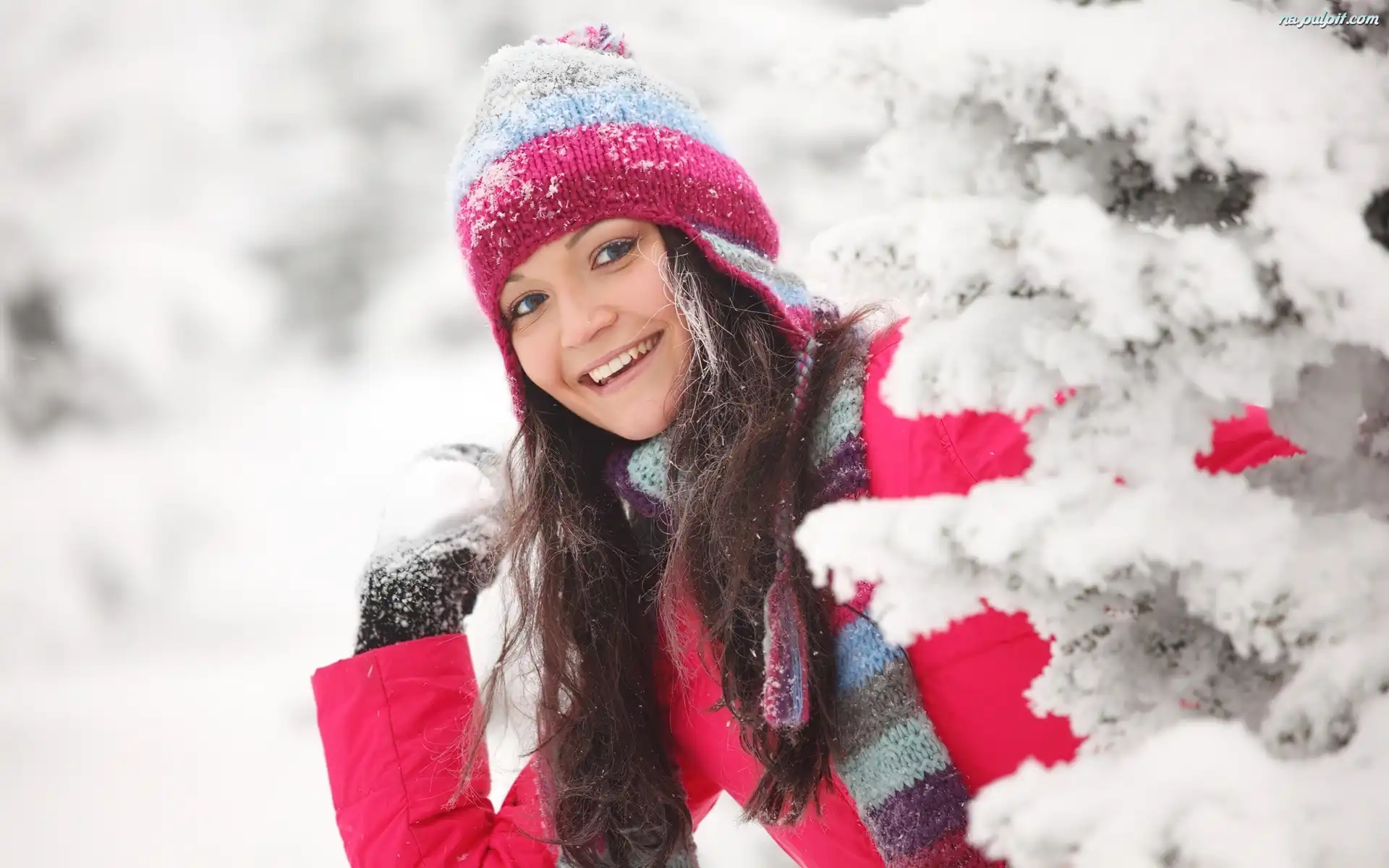 Śnieg, Piękna, Uśmiechnięta, Kobieta
