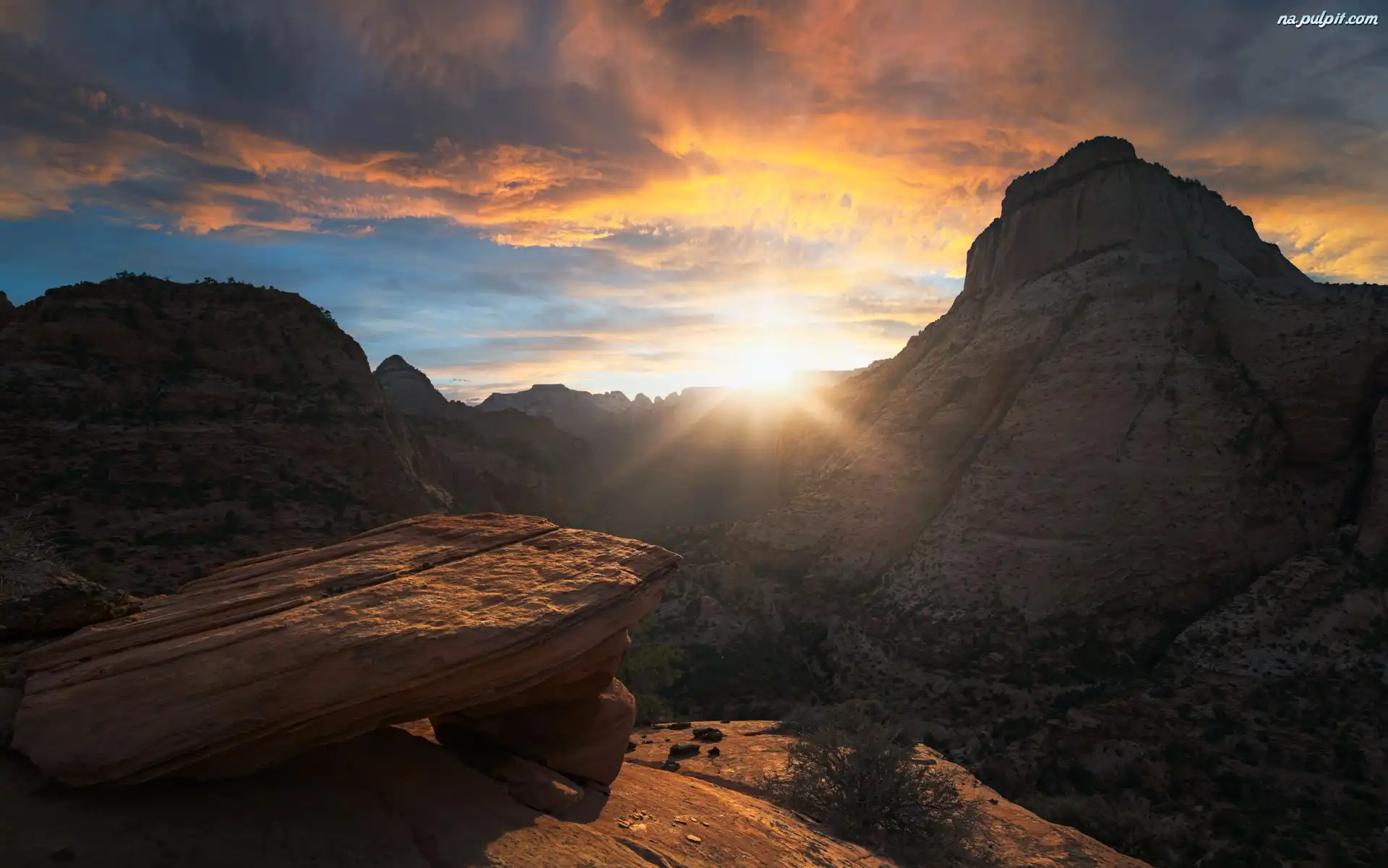 Zachód słońca, Skały, Góry, Stany Zjednoczone, Utah, Park Narodowy Zion, Drzewa Na Pulpit