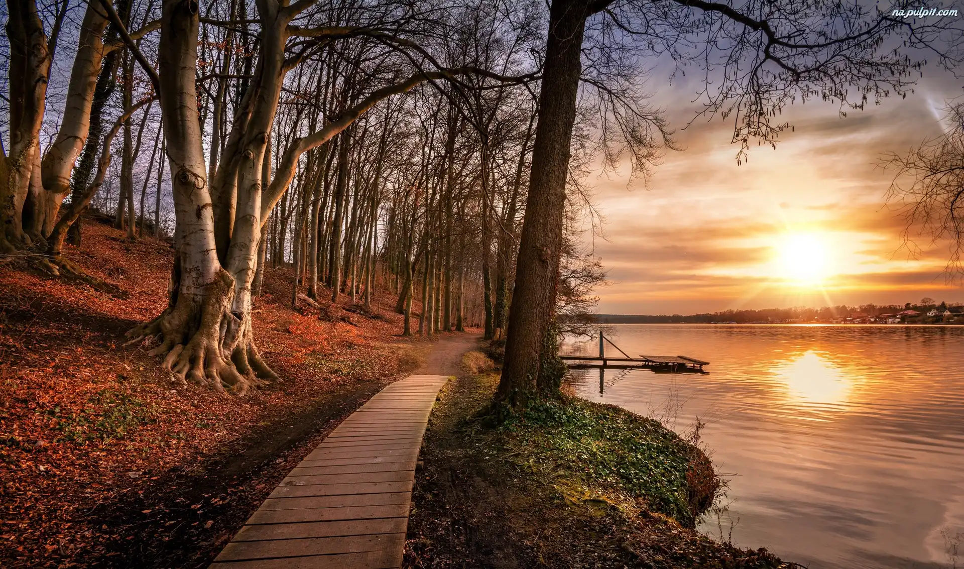 Ścieżka, Prowincja Utrecht, Wieś Leersum, Park, Jesień, Wschód słońca, Jezioro, Holandia, Pomost Na Pulpit |