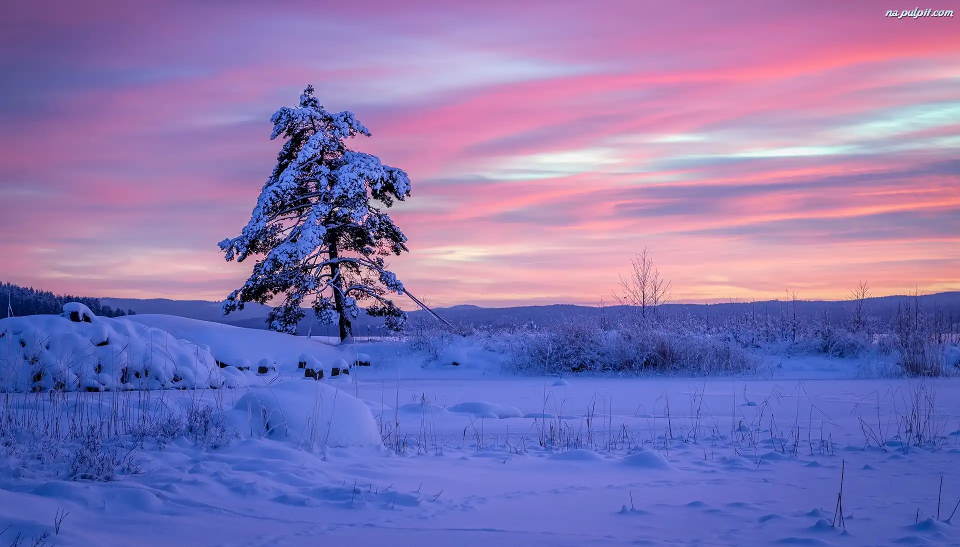 Drzewo, Region Värmland, Ośnieżone, Zima, Gmina Arvika, Szwecja, Wschód słońca Na Pulpit
