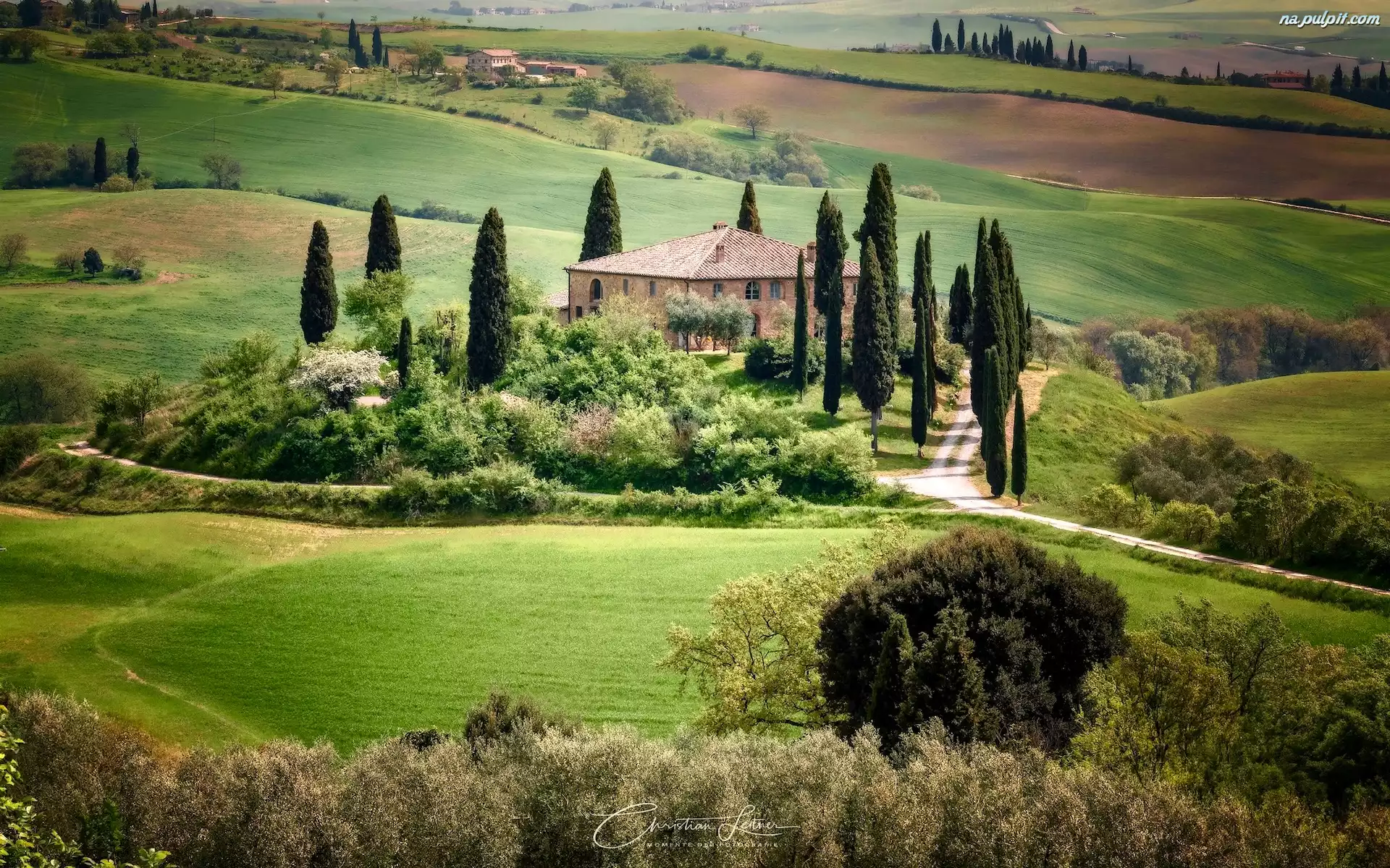 Cyprysy, Droga, Toskania, Podere Belvedere, Wzgórza, Val dOrcie, Włochy, Dom, Pola Na Pulpit