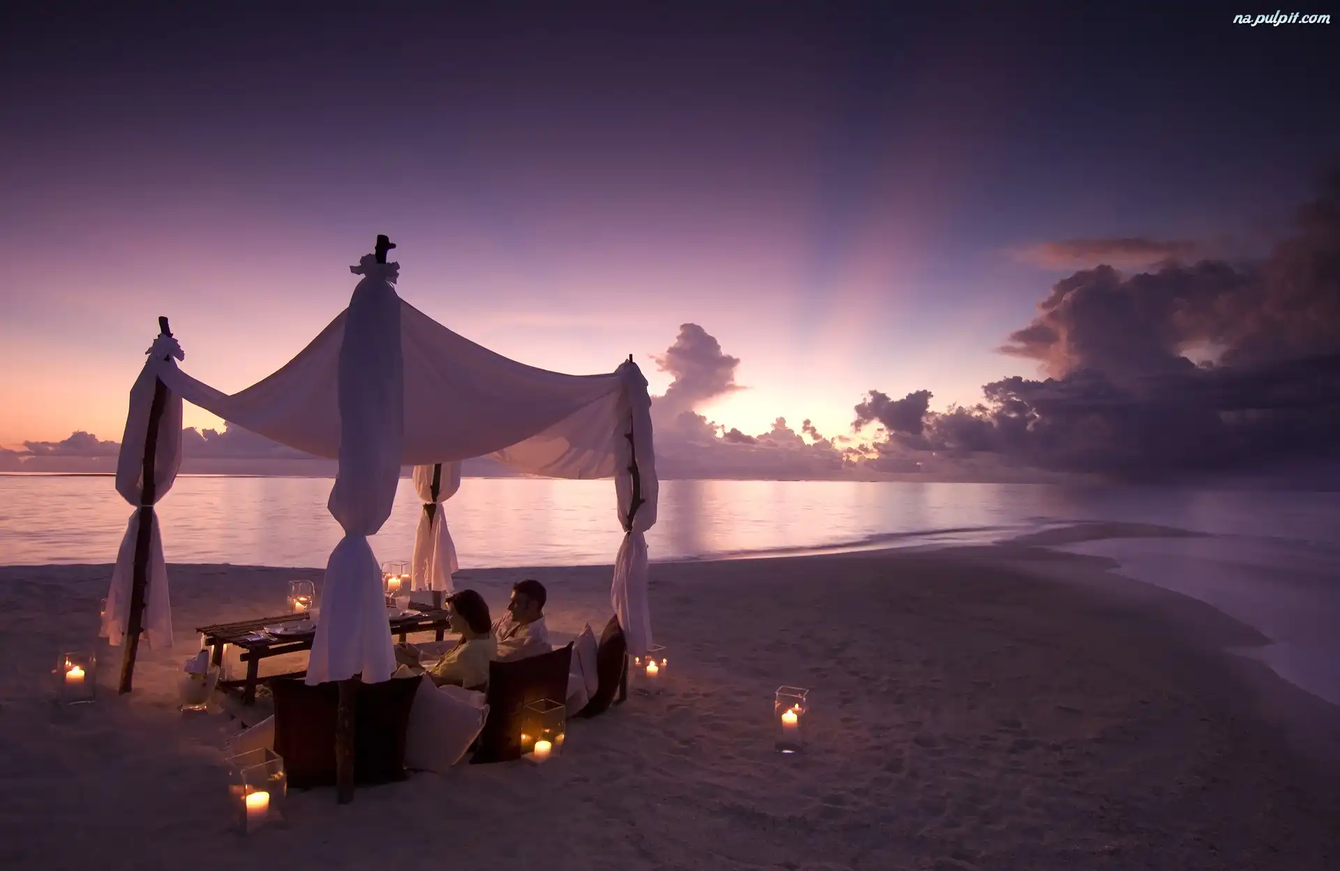 Morze, Wakacje, Romantycznie, Plaża, Chmury, Namiot, Para, Świece Na Pulpit
