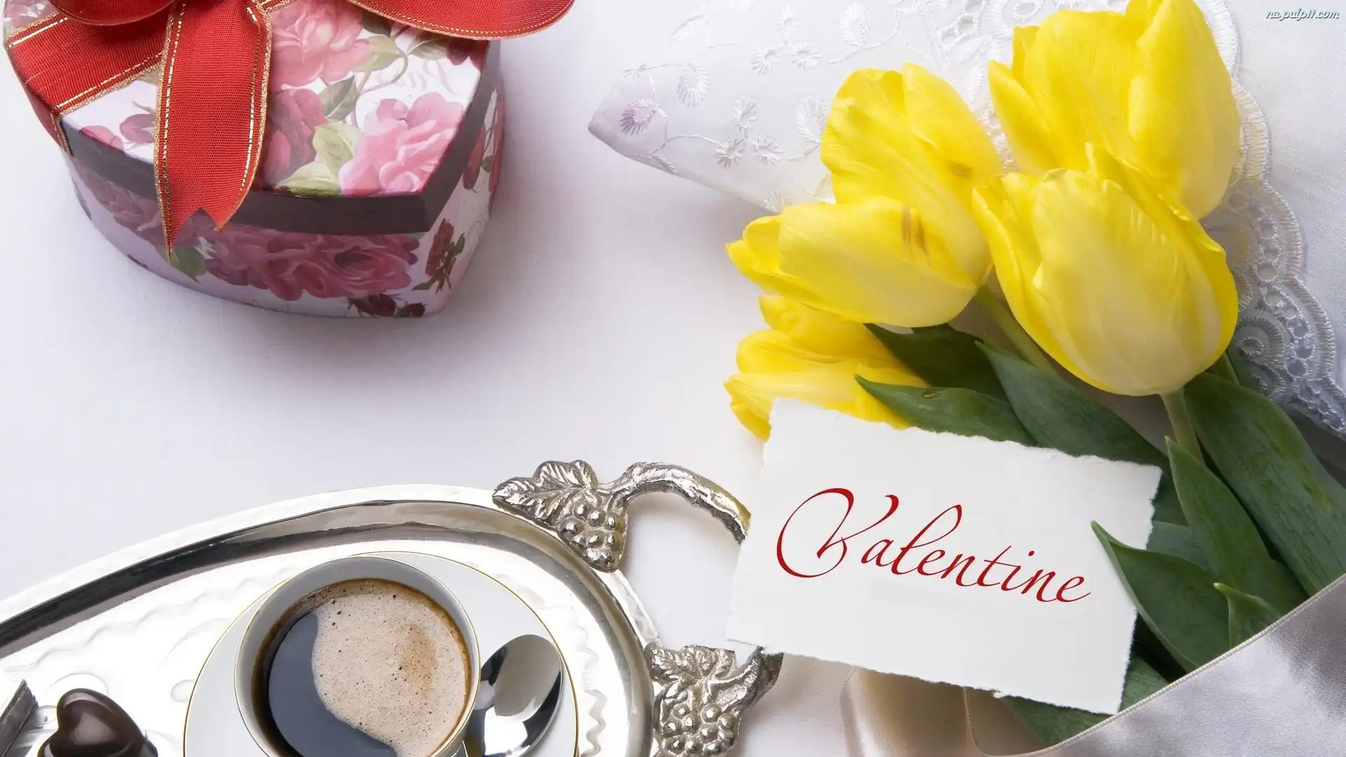 Walentynki, Kawa, Tulipany, Żółte, Prezent