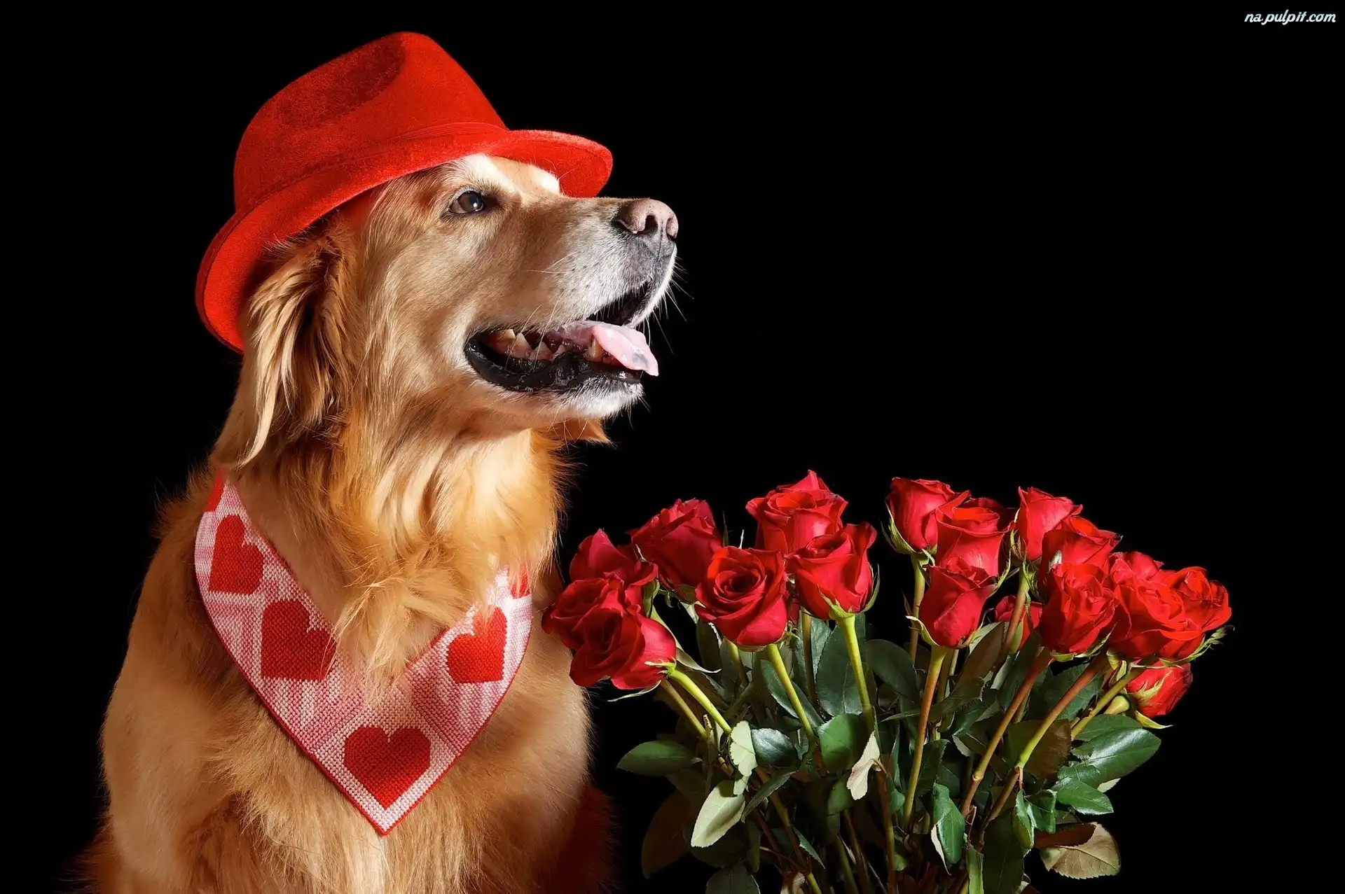 Golden Retriever, Róże, Czerwone, Piesek, Walentynki