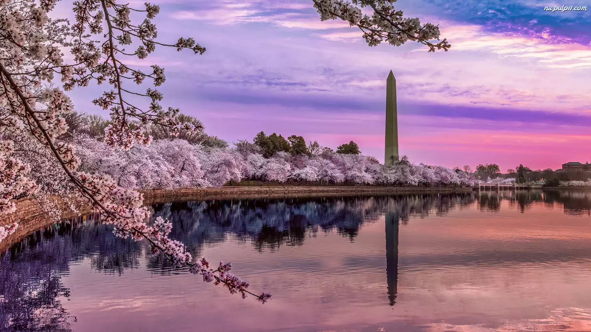 Okwiecone, Zbiornik, Park National Mall, Wiosna, Waszyngton, Jezioro, Tidal Basin, Drzewa, Stany Zjednoczone, Obelisk, Pomnik Waszyngtona Na Pulpit |
