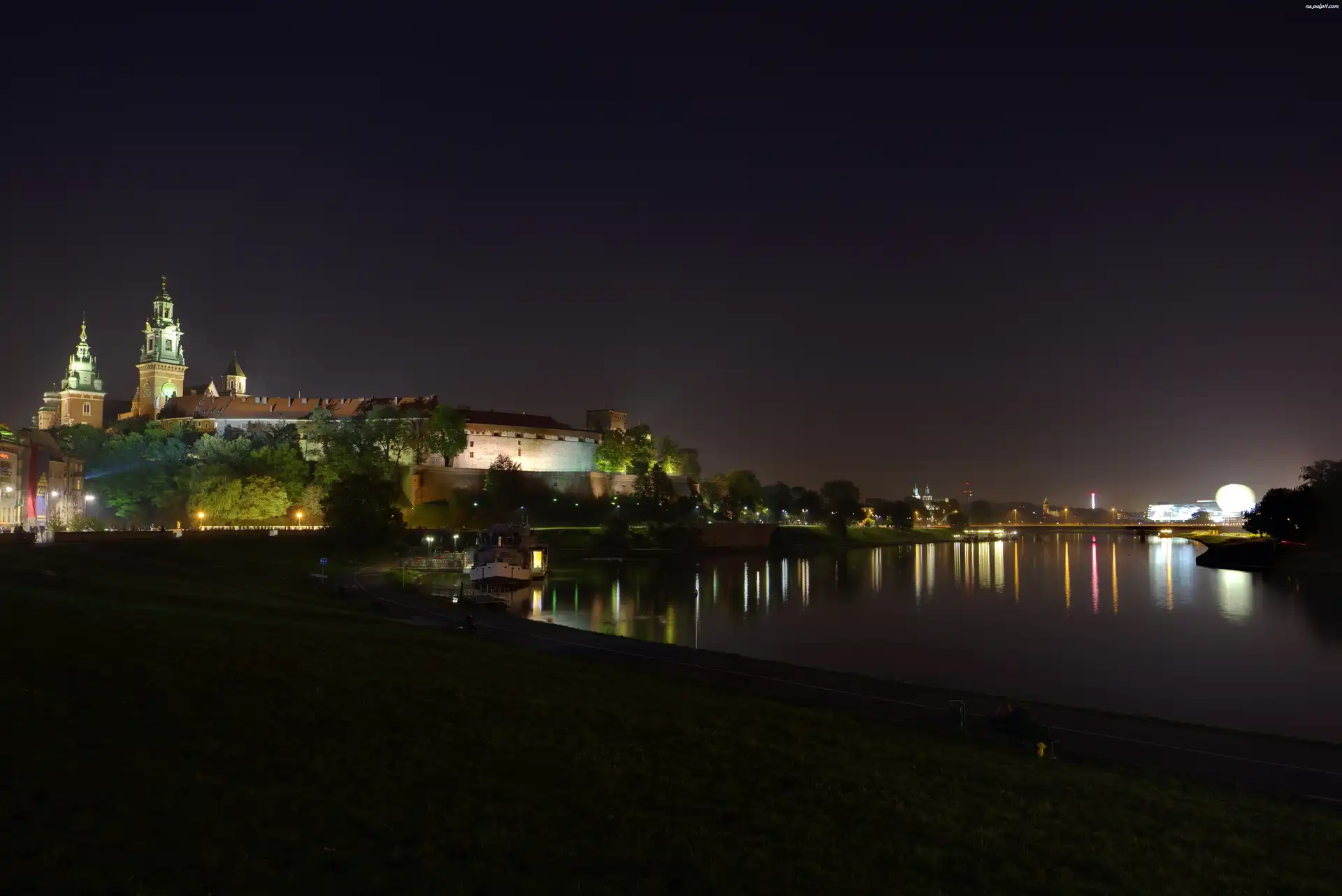 Kraków, Rzeka Wisła, Noc, Zamek Królewski na Wawelu, Polska, Wawel Na Pulpit