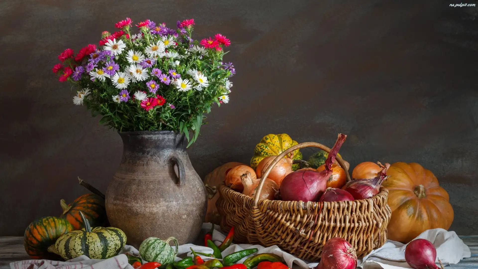 Dynia, Wazon, Bukiet, Cebula, Papryka, Kwiaty, Kompozycja, Astry
