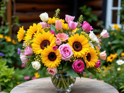 Stolik, Kwiaty, Róże, Wazon, Słoneczniki, Bukiet